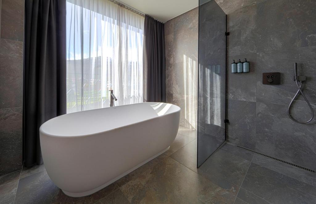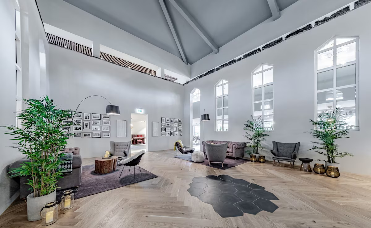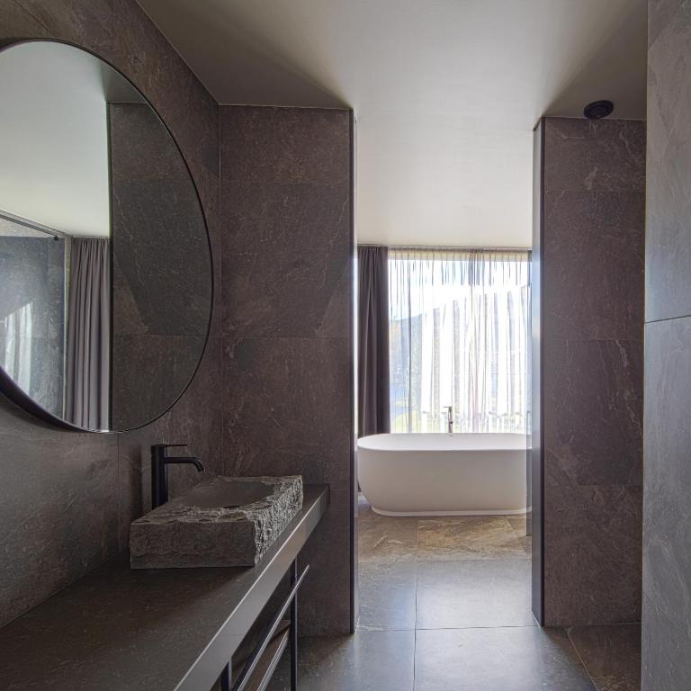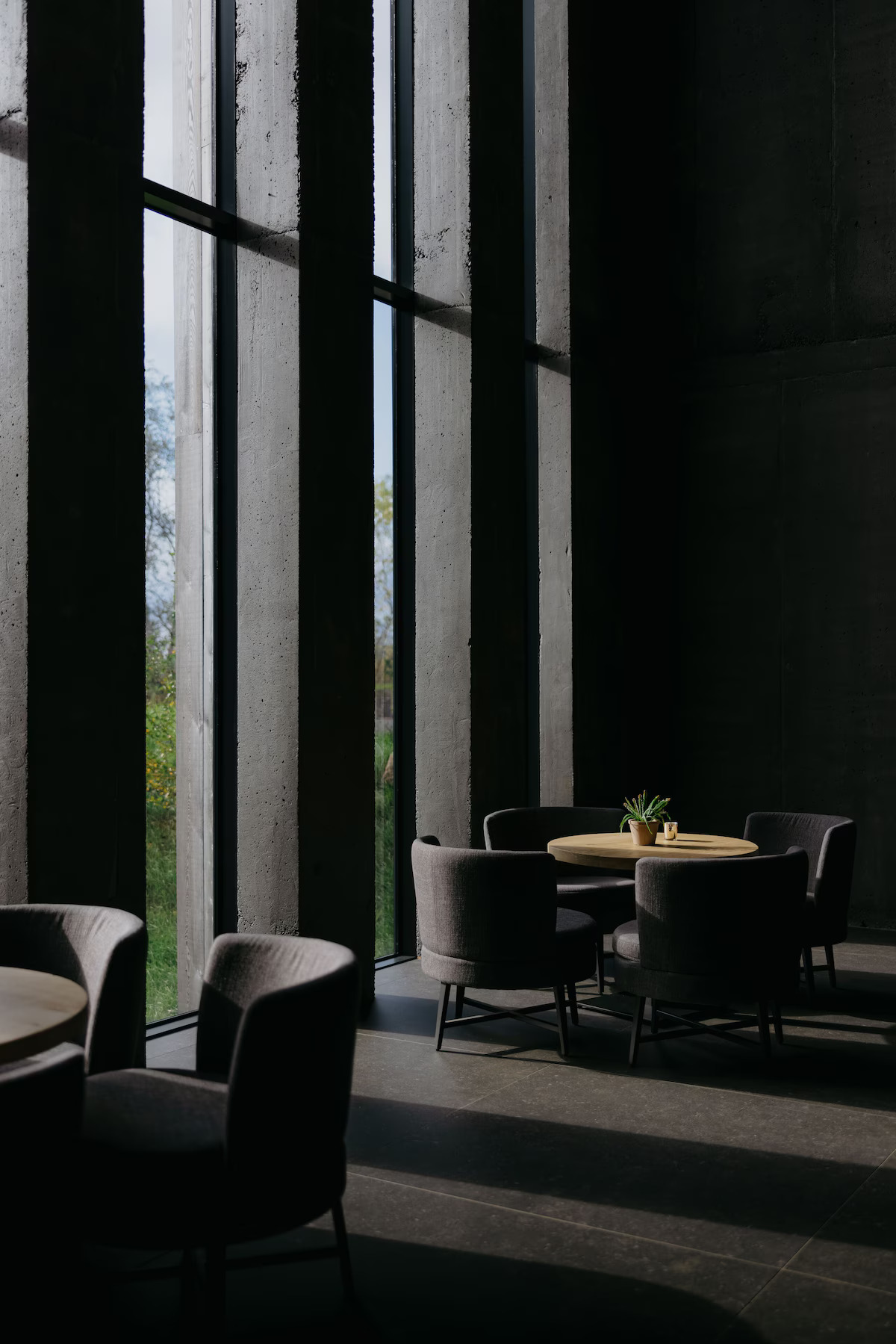 The interiors are defined by minimalist Scandinavian simplicity sharpened by industrial bone structure. High ceilings and expansive glass elevate each room into a space of quiet reflection, offering uninterrupted views of Strokkur or the surrounding mossy hills. The lobby is a sensory gateway: tall ceilings, vertical greenery, and a lightness that helps your eyes — and mind — adjust after time spent outdoors.