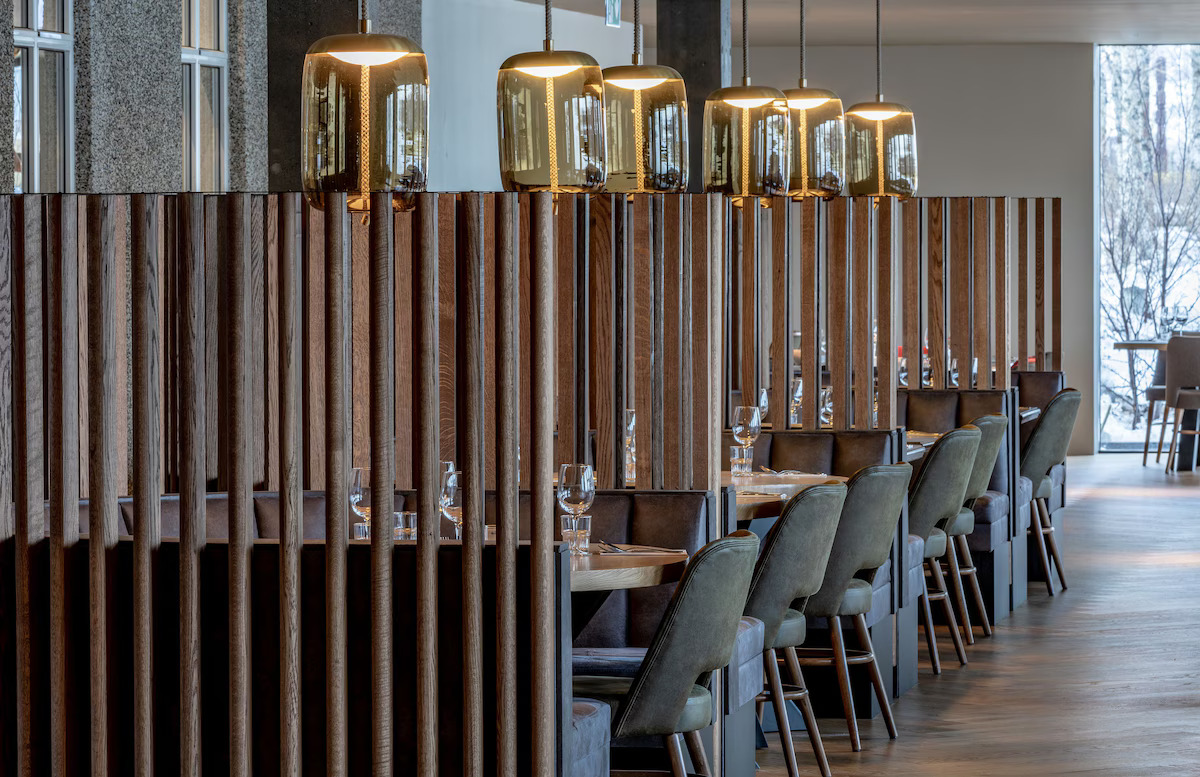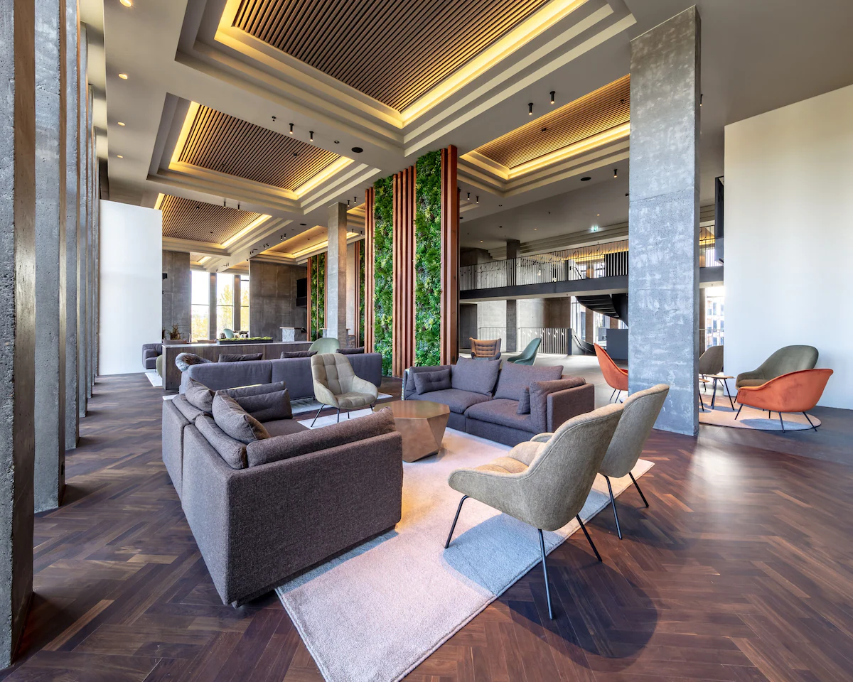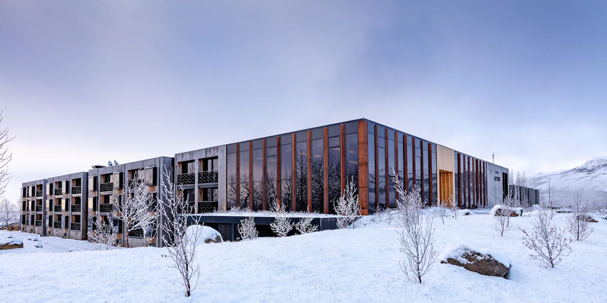 Designed by Brynhildur Sólveigardóttir, the hotel’s exterior is an exercise in visual harmony. A façade of earth-toned wood, glass, and concrete rises from the valley floor, intended to blend into the terrain rather than dominate it. The effect: a building that emerges subtly from the landscape, as though shaped by geothermal pressure. Inside, the industrial austerity of concrete is balanced by softer textures: plush furnishings, wool blankets, and strategic greenery in the lobby. Large windows saturate the interior with natural light, ensuring the geysers, hills, and skies remain constant companions.
