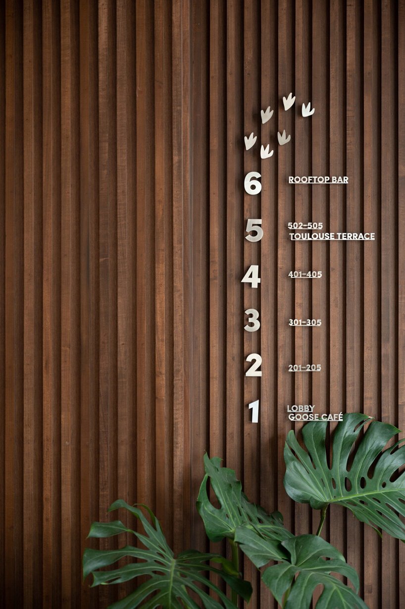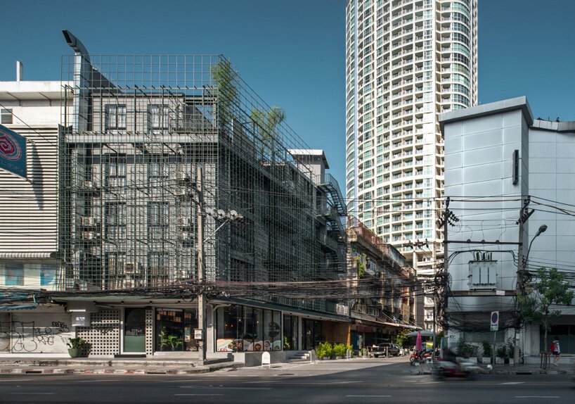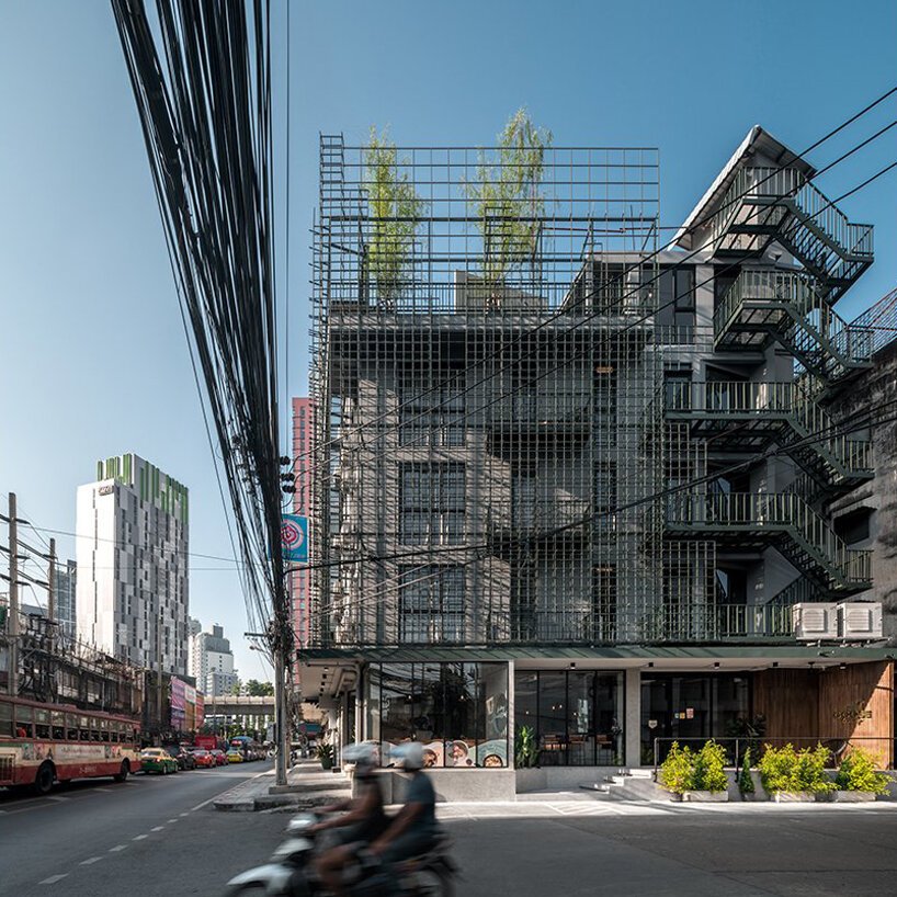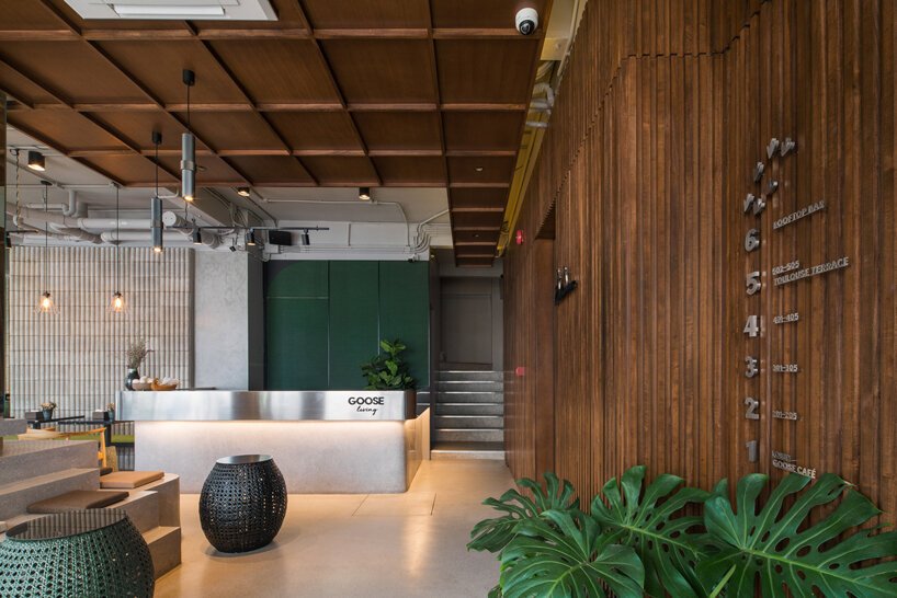Goose Living transforms a 40-year-old five-story shophouse in Bangkok into a striking design-led boutique hotel, where architecture meets imagination. The entire building is sheathed in a layered steel grid façade—a sculptural interpretation of truncated mountain peaks—creating a dreamlike illusion of a geometric forest cloaking the city retreat. It’s a bold architectural gesture that sets Goose apart in Bangkok’s dense urban fabric, and turns a once-forgettable building into a creative landmark.