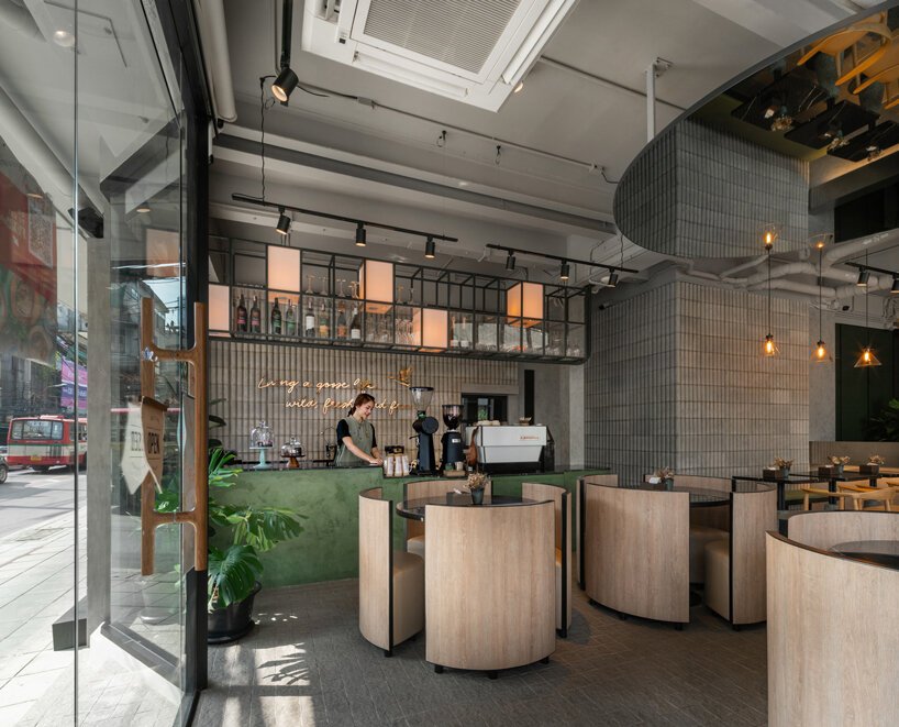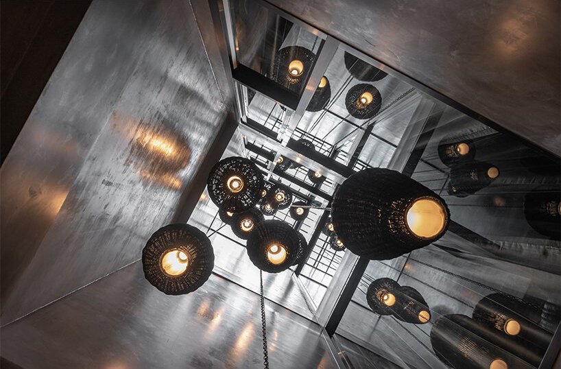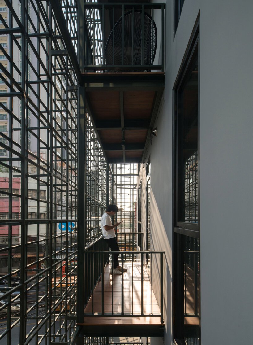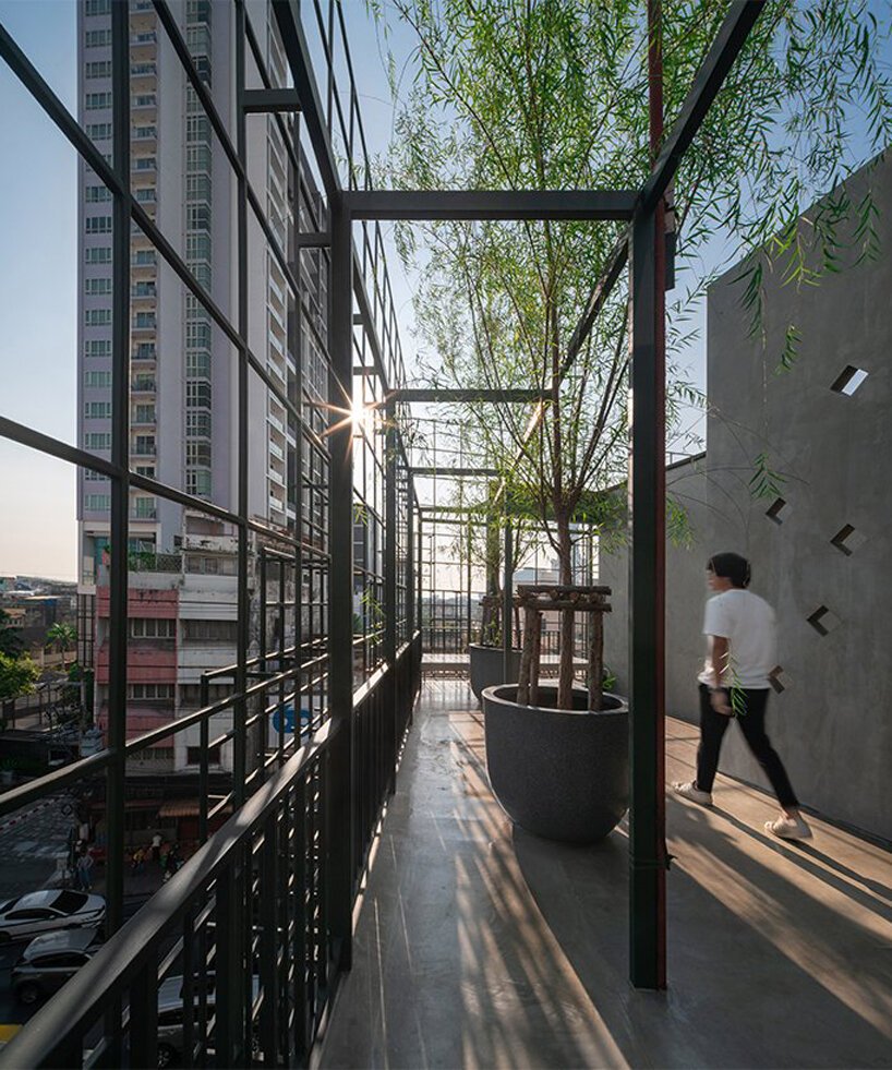 The concept here is both playful and precise. Every element—from the cascading skylight carved through the building’s core, to the muted industrial palette—invites curiosity and calm. Designed by Thai firm AOMO, the interior retains a sense of vertical drama without sacrificing warmth. The mini courtyard, sculpted from the fifth to the second floor, floods the inner rooms with daylight and provides unexpected greenery—making even the innermost spaces feel alive.