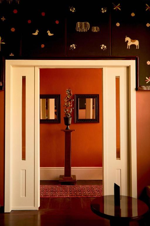 The interiors bear the unmistakable imprint of Fabrizio Casiraghi, whose mastery lies in evoking atmosphere without sacrificing function. Here, he choreographs a balance of old-world refinement and subtle theatricality, resulting in spaces that feel both storied and surprising. Crown moldings and marble fireplaces speak to the townhouse’s history; hand-selected tapestries and patinated finishes introduce European richness. The palette—soft creams, moody olives, and warm rust tones—casts a cinematic glow across each room, allowing every detail to take its place in the spotlight.
