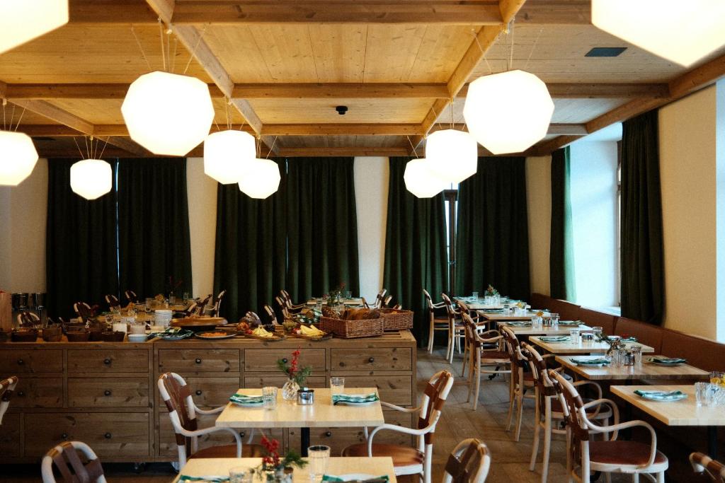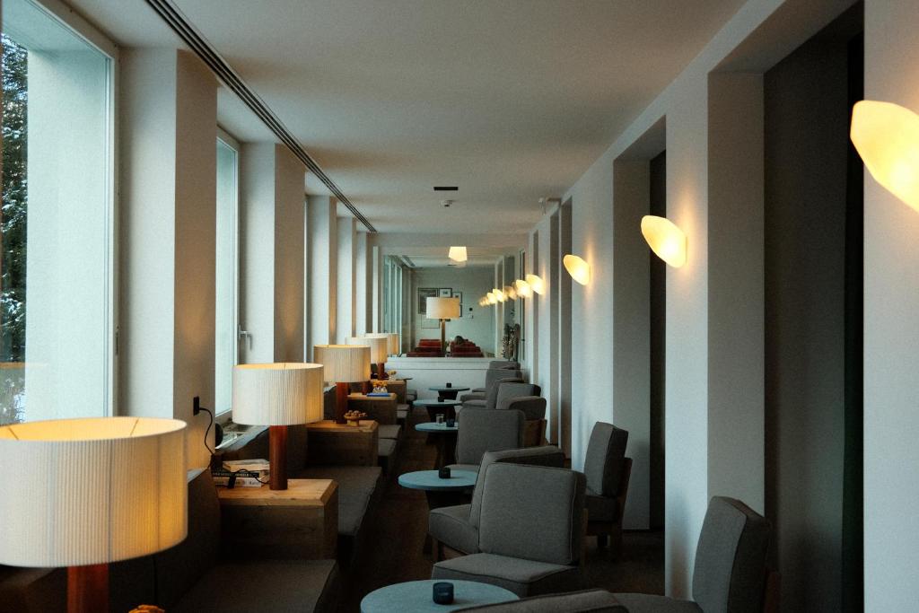 The hotel’s spa, a striking brutalist structure nestled between the two main buildings, draws inspiration from Japanese onsen. Facilities include heated indoor and outdoor infinity pools that seem to merge with the surrounding peaks, as well as saunas, a hammam, and treatment rooms offering therapies using Susanne Kaufmann products. The design is minimalist yet warm, with stone, timber, and natural light creating a tranquil retreat that harmonizes with the alpine environment. Whether floating in the pool as snowflakes drift down outside or basking in the summer sun from a lounger on the spa terrace, guests are enveloped in stillness and serenity.