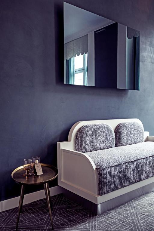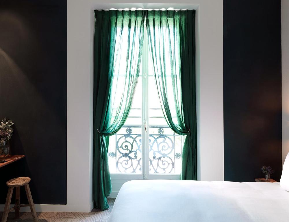 Interior designer Dorothée Meilichzon drew inspiration from the surrounding neighborhood, infusing the hotel with a sense of Parisian whimsy and old‑world charm. The 50 rooms blend cozy intimacy and theatrical detailing: wooden stools placed near windows dressed in floor‑sweeping curtains, soft muted palettes juxtaposed with deep jewel tones, and subtle historical references that echo the townhouse’s 18th‑century roots.