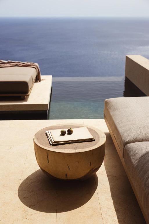 There’s no marble-and-gilt flash here. Instead, it’s marble underfoot, handmade wood, open-air showers, and that distinct Cycladic calm. Interiors whisper in neutral tones. Outside, the cliffside pool and swim-up bar are effortlessly chic. There’s a subterranean spa, a gym for the sunrise crowd, and an organic farm feeding the kitchen. But the real luxury? Space. Stillness. That view.