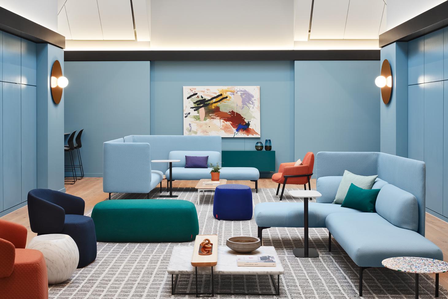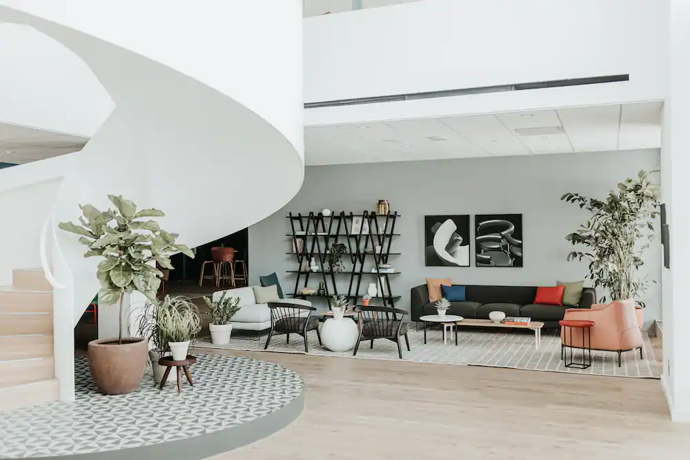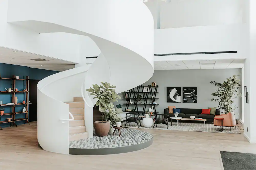 At the heart of the hotel is a lobby designed to linger in, not pass through. Urquiola’s signature touch is clear: sculptural lines, textured materials, and an emphasis on light and flow. A grand spiral staircase rises as the focal point, equal parts functional and poetic. Around it, flexible seating, soft colors, and Haworth’s own furniture create an environment that shifts seamlessly between lounge, workspace, and social forum.
