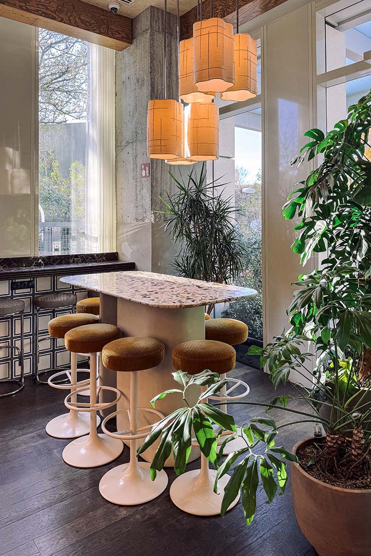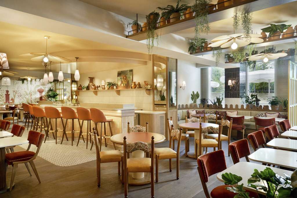 The Hoxton has always been known for its impeccable sense of place, and AIME Studios—Ennismore’s in-house design team—has outdone itself here. Drawing inspiration from the building’s Brutalist DNA, they’ve created interiors that celebrate structure, texture, and tone. Expect a tactile symphony of polished plaster, pink marble, walnut cabinetry, and geometric patterns offset by Belgian vintage furniture and lush greenery that nods to the gardens outside. Local artistry plays a starring role too, with colorful murals by Madeleine Schilling and Claire de Quenetain energizing the common areas. It’s a space that feels both grounded in Brussels’ architectural heritage and refreshingly contemporary—a Brutalist frame softened by soul and warmth.