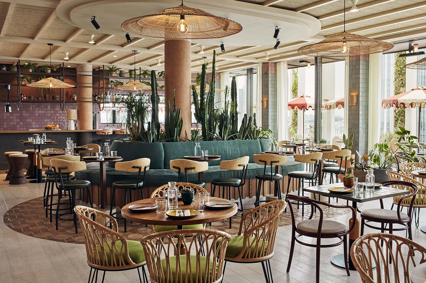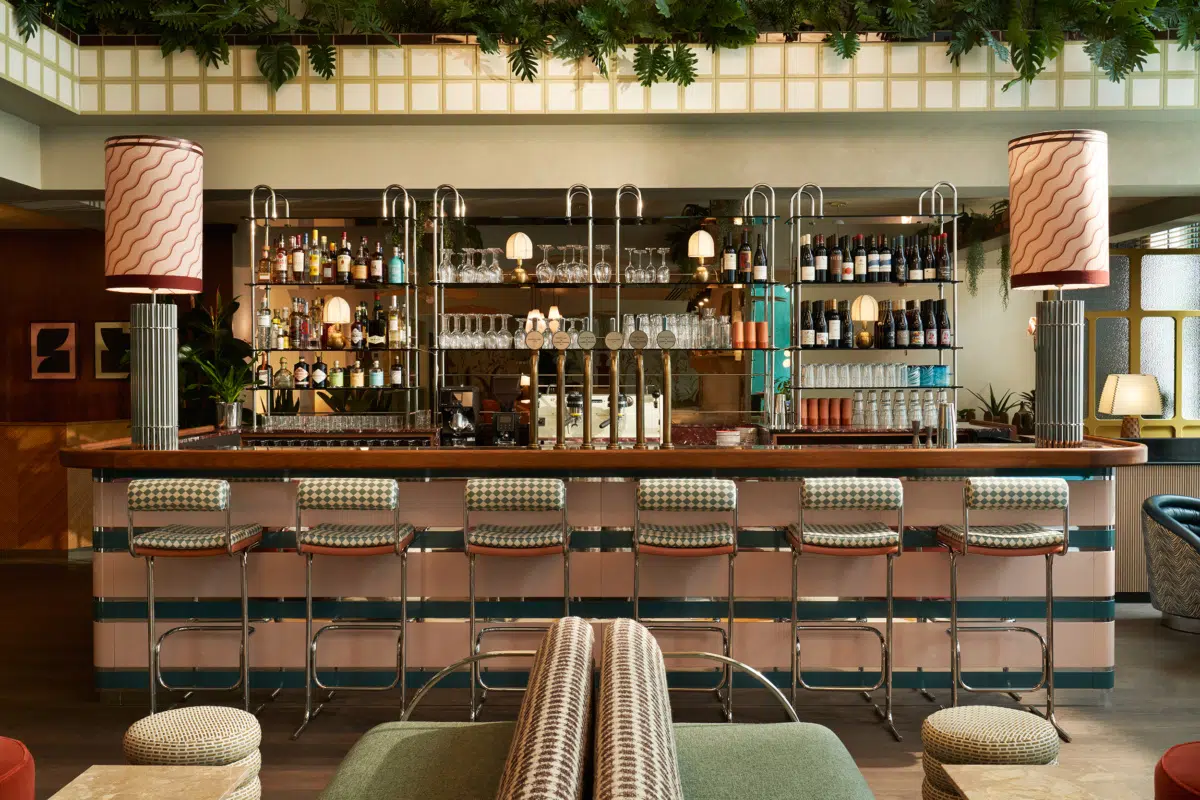 Across 198 guestrooms—ranging from Cosy to Biggy—The Hoxton’s playful design language continues. Each room feels like a stylish apartment rather than a typical hotel space. Velvet headboards, graphic rugs, brass accents, and floor-to-ceiling windows bring comfort and character in equal measure. The color palette is pure retro sophistication: sage greens, ochres, rose tones, and deep walnut woods create a cocoon of understated glamour. Every detail has been designed to delight—from the curated vinyl record selections to the local artwork and vintage lighting. It’s the kind of room where you’ll want to pour a drink, throw on a record, and let the city’s hum fade into the background.