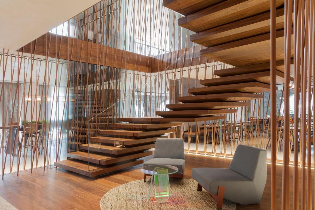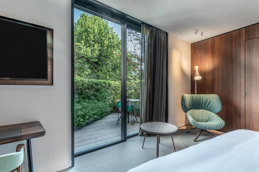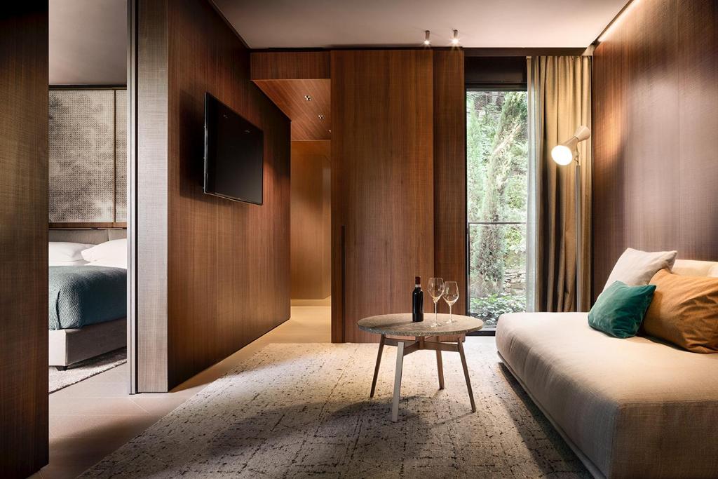 Il Sereno is unmistakably Urquiola. From the floating staircase in the lobby to the custom furnishings in every suite, her signature language of soft modernism and tactile richness sets the tone. Neutral palettes with flashes of ochre and petrol blue echo the colors of the lake and surrounding forest. Everything—from the linen robes to the brass fixtures—feels deeply considered, harmonizing with the landscape rather than competing with it.