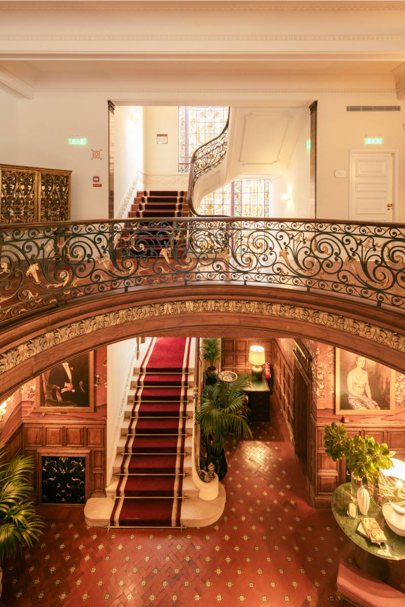 Step inside and you’re swept into a Wes Anderson-worthy dreamscape: grand staircases spiraling under glittering chandeliers, ornate plasterwork and stained glass glowing in Porto’s golden light, and handcrafted details everywhere you look. Leopard-print chairs, jewel-toned velvet armchairs, and bold patterned carpets add a playful wink to the heritage setting. A recent top-to-bottom makeover polished the hotel’s original splendor without sanding off its character. Now it strikes that elusive balance: classy, not stuffy. Luxe, but laid-back. It’s as easy to curl up with a book in the library as it is to sip cocktails under a frescoed ceiling.