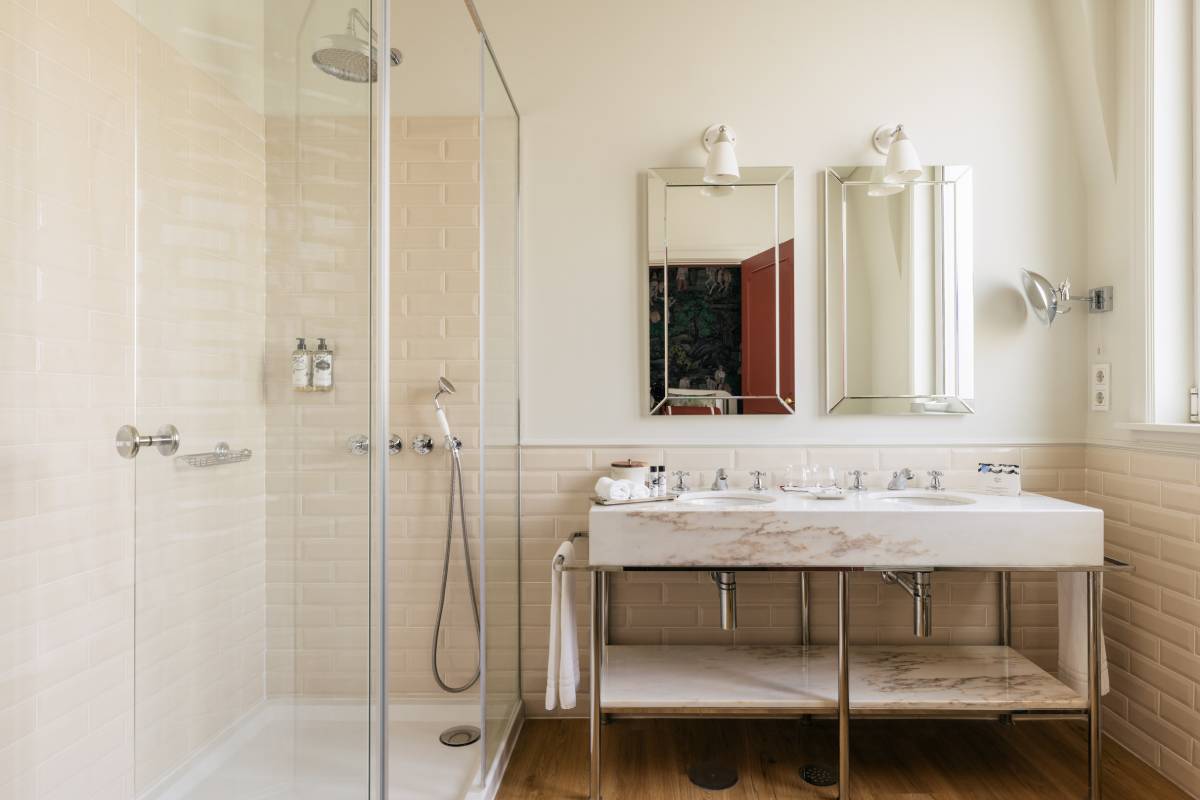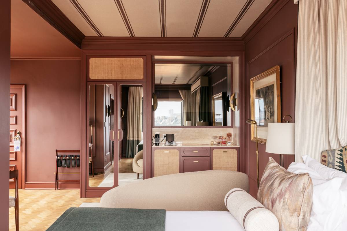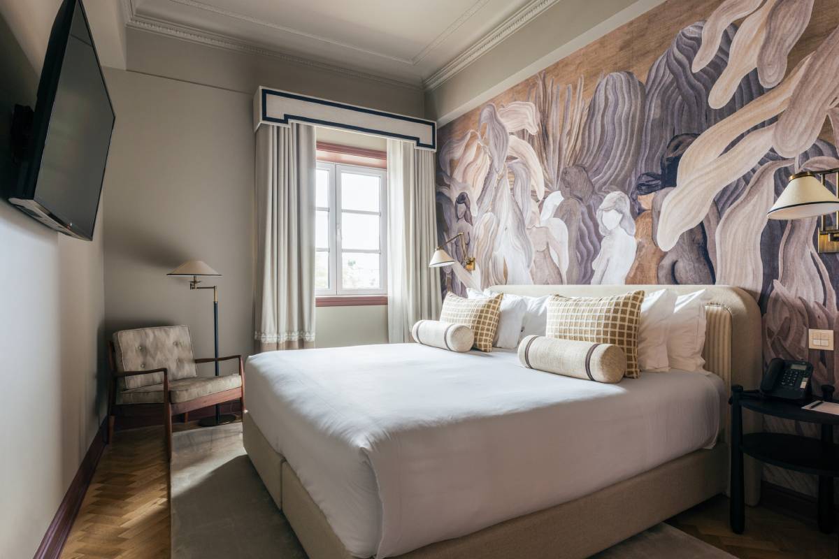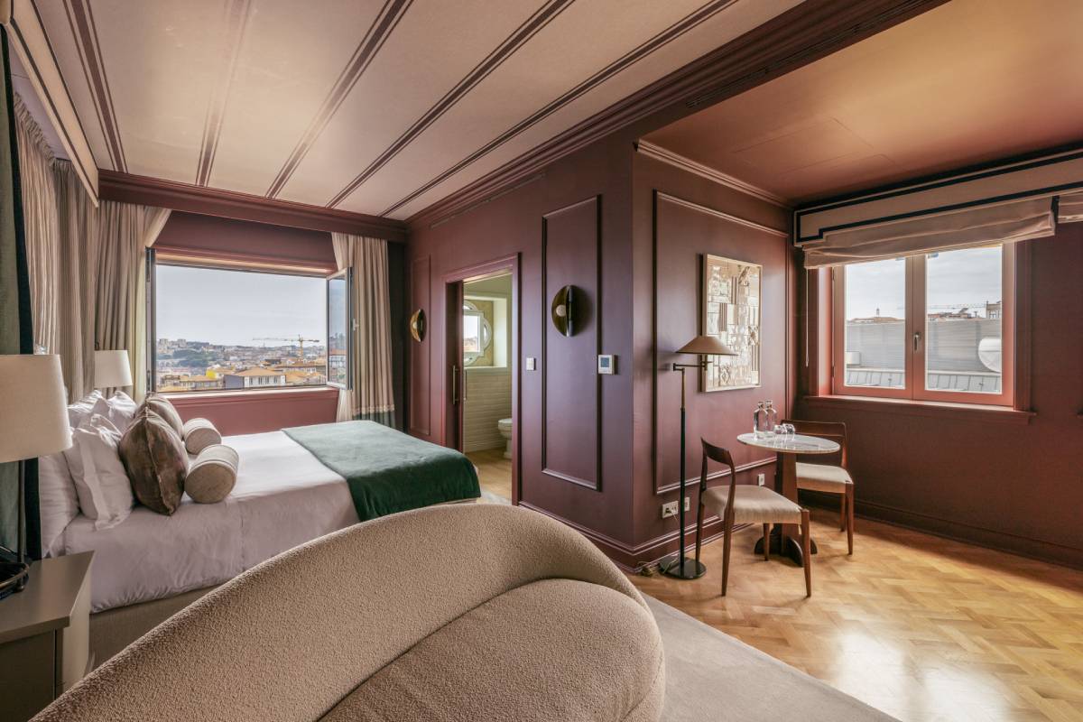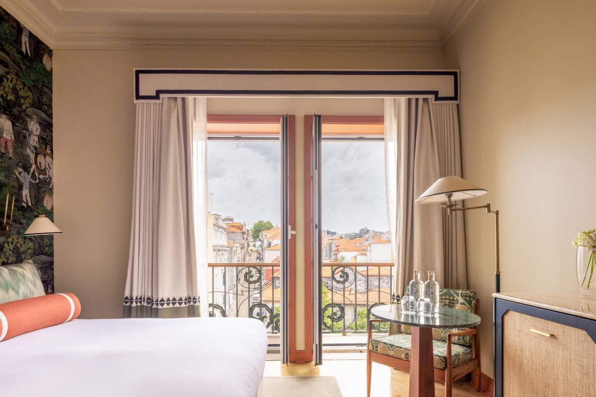 The 85 rooms and suites carry the same eclectic elegance, layering period detailing with contemporary comforts. High ceilings and tall windows flood the spaces with light, while rich textiles, modern lighting, and sleek marble bathrooms keep things firmly in the 21st century. Some suites overlook the tiled rooftops of Porto’s historic center, offering a front-row seat to the city’s timeless charm. Turn-down chocolates, plush robes, and dream-soft bedding make it all too easy to linger just a little longer.