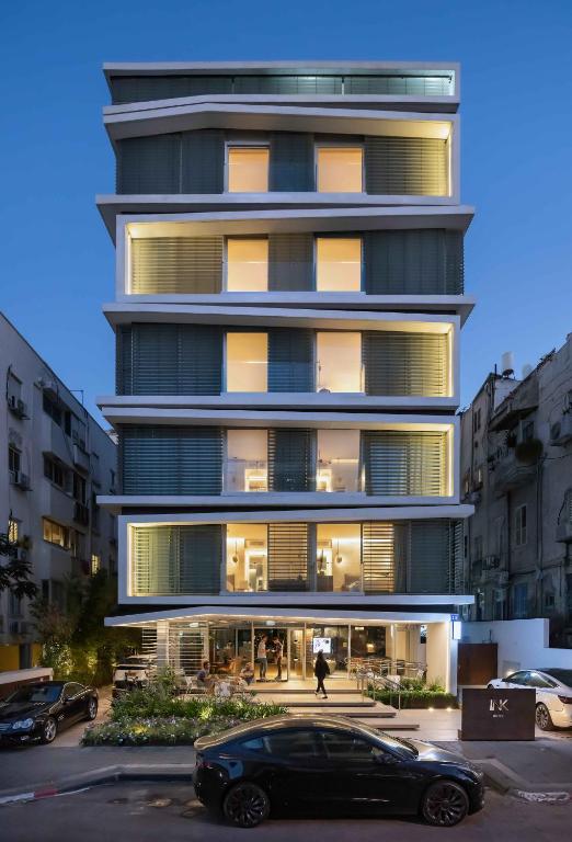 A compact rooftop pool and terrace invite guests to soak up the Mediterranean sun, framed by skyline views that stretch from the Bauhaus blocks of the city center to the sea. It’s intimate, stylish, and very Tel Aviv—relaxed by day, electric by night.