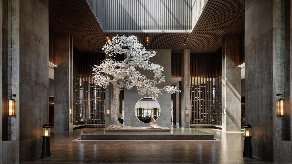Conceived by LTW Designworks, the hotel’s architecture and interiors are a poetic reflection of Confucian ideals. The design narrative is rooted in the Six Arts—music, calligraphy, mathematics, archery, chariot-riding, and ritual—translated into spaces that engage the senses and the spirit. Guests enter through a grand lobby crowned by a seven-meter gingko tree art installation, beneath which a commanding statue of Confucius greets them—a symbol of wisdom and enlightenment. Traditional design elements—moon gates, bronze lattice screens, carved stone reliefs—are woven into the modern fabric of the interiors, creating a space that feels timeless, contemplative, and deeply Chinese.
