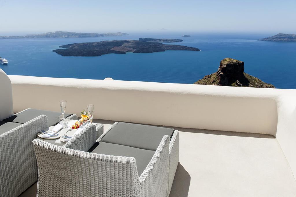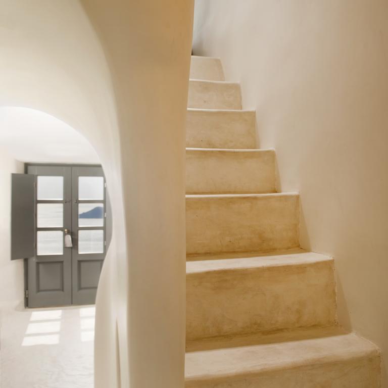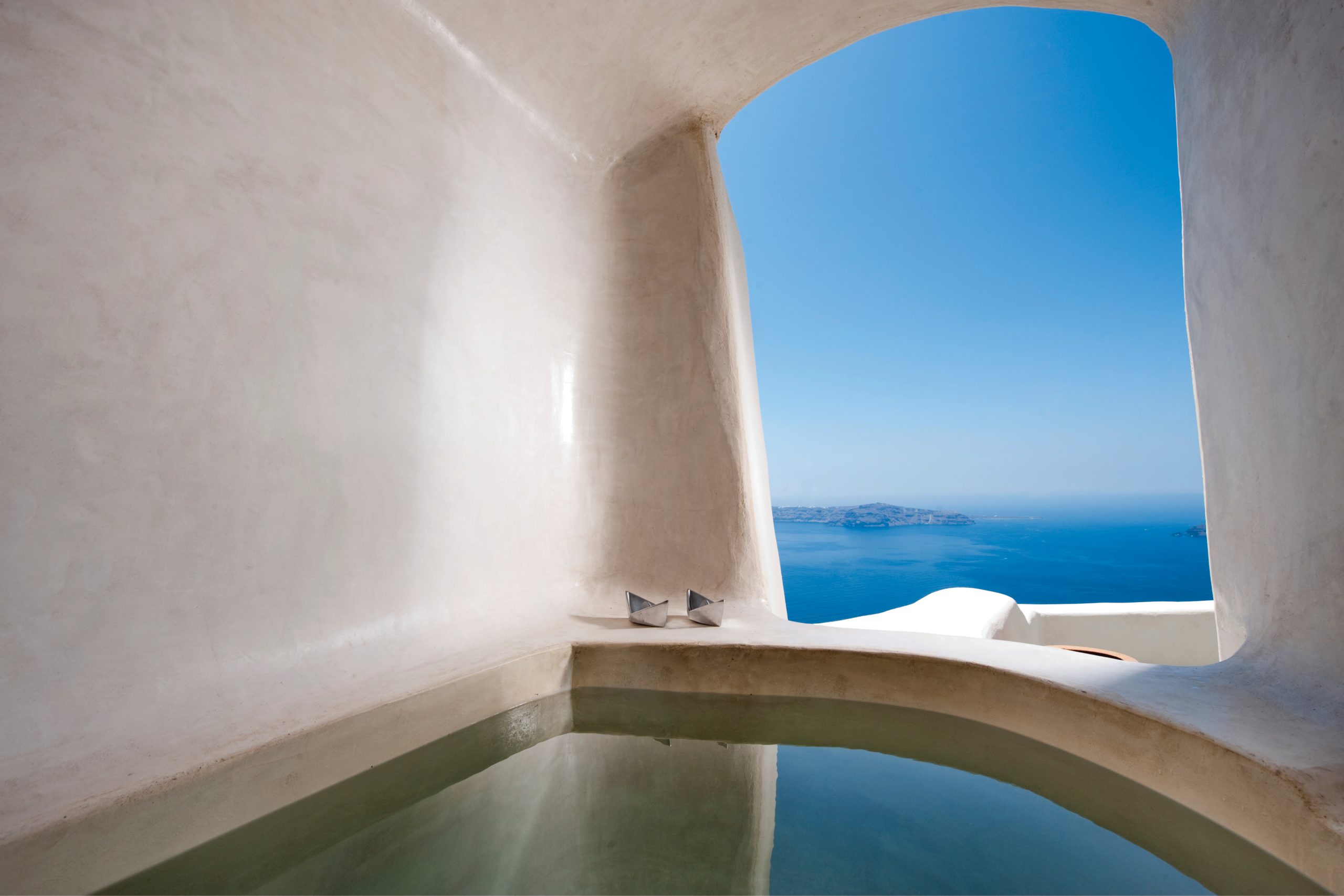 Each space is tailored for quiet elegance—understated furnishings, crisp textiles, and thoughtful lighting allow the structure and setting to shine. From private verandas to the infinity pool perched on the caldera’s edge, every perspective frames the sea and sky.