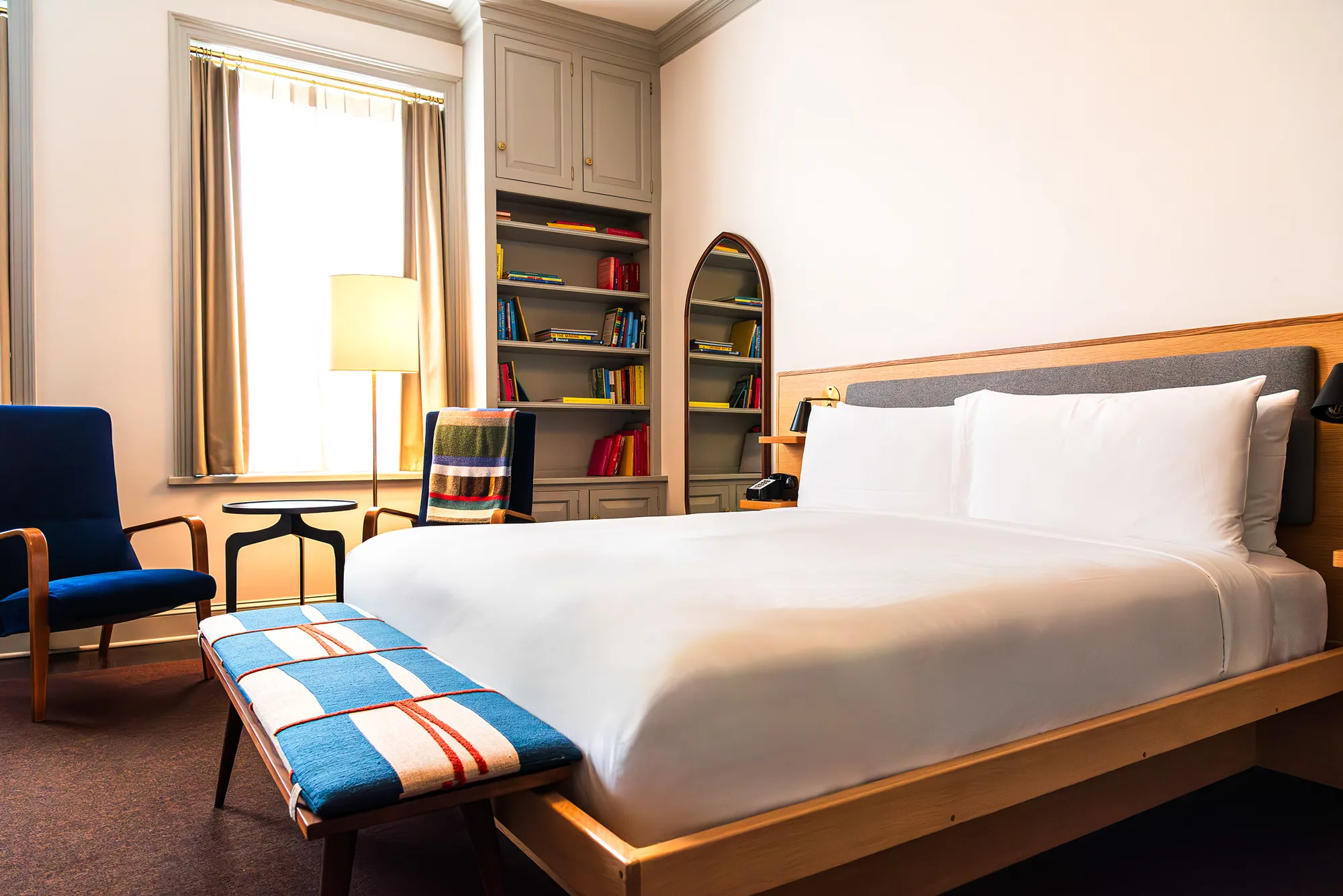 Each of the hotel’s buildings retains its distinctive soul. Tin ceilings, antique tiles, and original architectural details whisper of Kingston’s layered past. Against this backdrop, interiors carry a fresh, modern voice: Scandinavian minimalism softened by folkloric accents, vintage furnishings, and curated art. The collaborative design effort—initiated by Studio Robert McKinley and continued by Vanessa Guilford of TOCCI alongside Aviva Blaichman—results in spaces that feel timeless, soulful, and decidedly current.