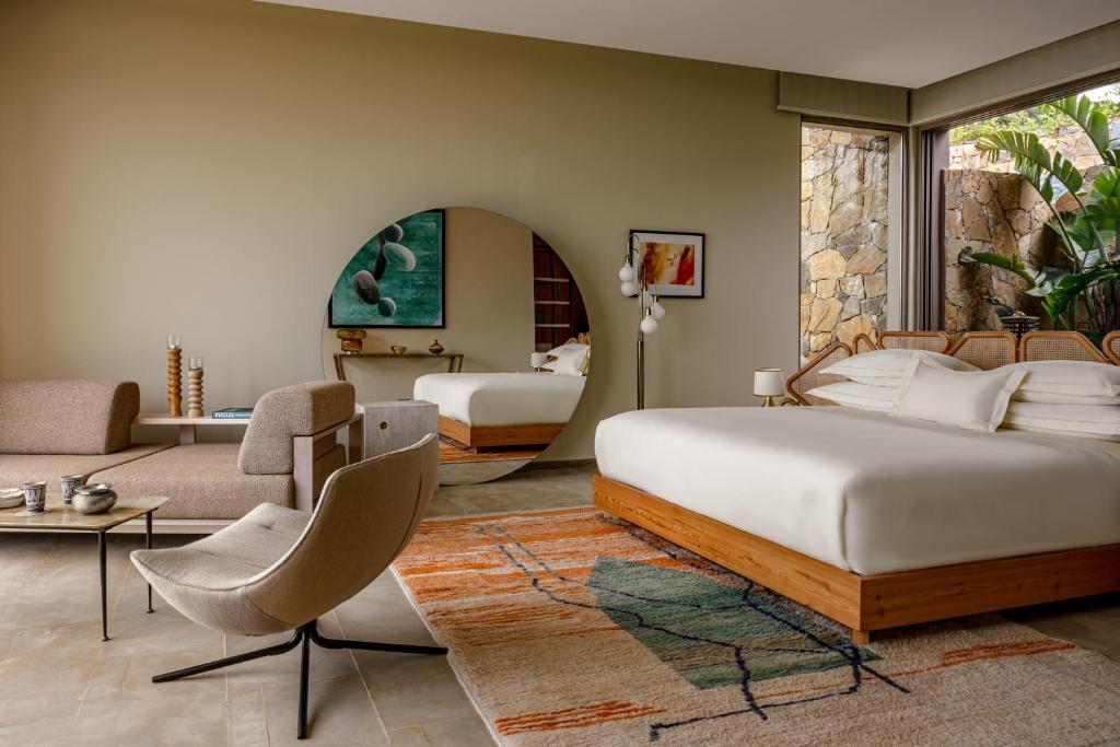 Guests can choose the sleek modernity of ocean-facing suites—each with a private pool and uninterrupted sea views—or immerse themselves in local tradition within the stone “chalets” of nearby Dchier village. These restored homes offer a deeper connection to the rhythms, textures, and stories of the region.