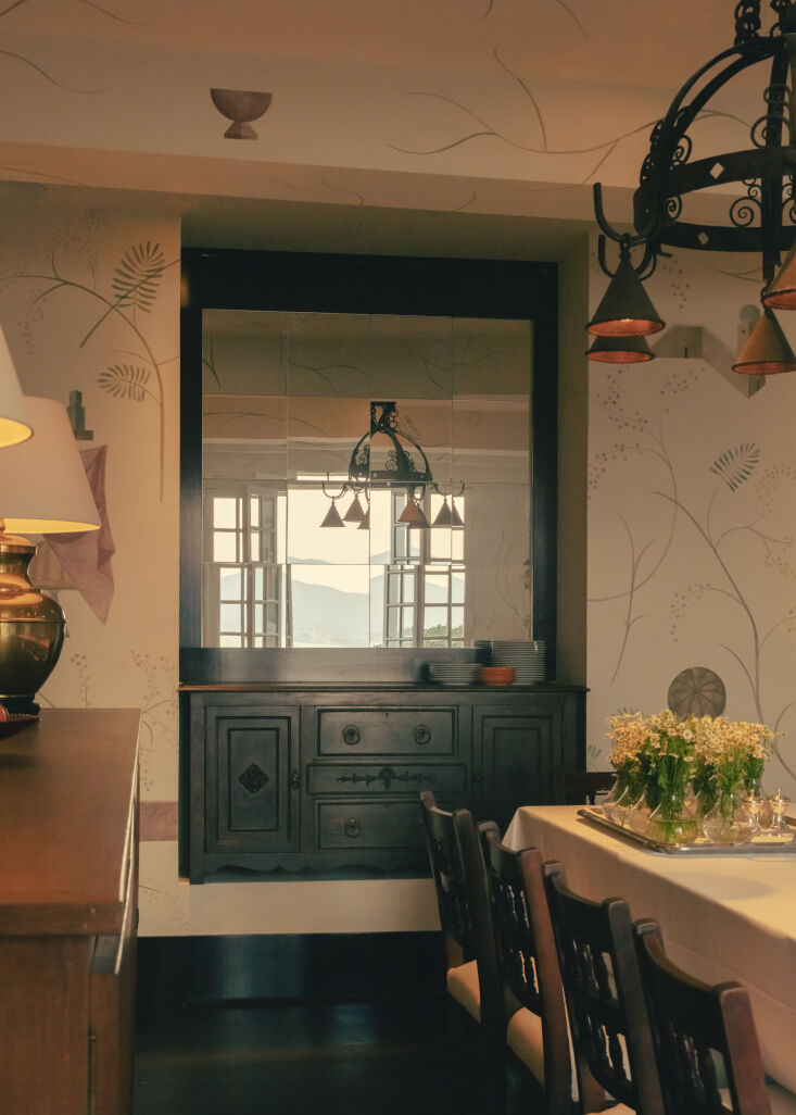 Casiraghi’s interiors revive Bardot-era decadence through mirrored panels behind the bar, American walnut wood ceilings, black-and-white checkered tiles, a glowing fireplace, and wrought-iron coffee tables with glass tops. The effect is timeless yet fresh, inviting guests to sink into an atmosphere of classic Riviera elegance.