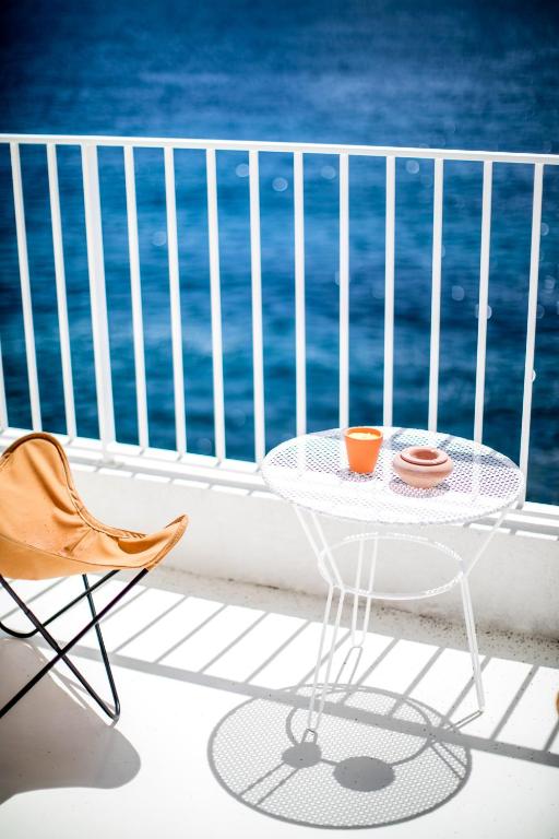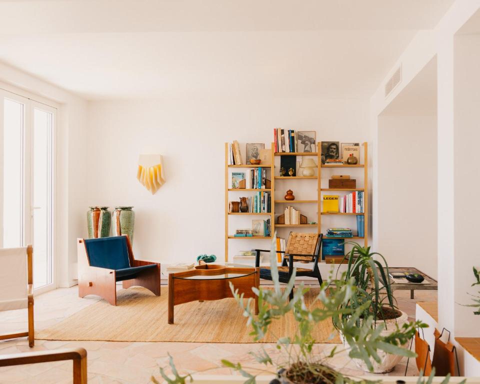 Inside, interiors evoke Riviera elegance with a restrained palette of azure blue, deep ochre, and radiant white. Furnishings include vintage Provençal objects and minimalist pieces by designers like Charlotte Perriand and Antoine Ricardou, paired with earthenware wall lamps and Rosemarie Auberson paintings. Floor-to-ceiling windows and open layouts emphasize light, air and uninterrupted sea views.