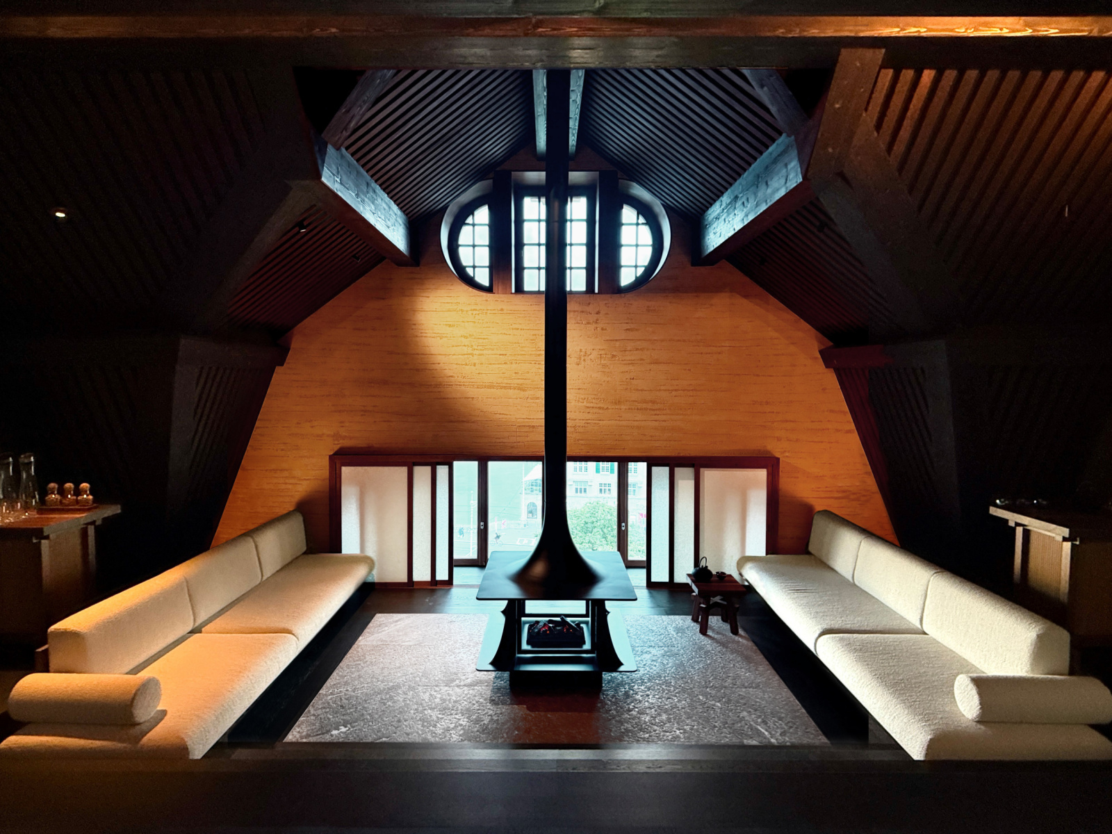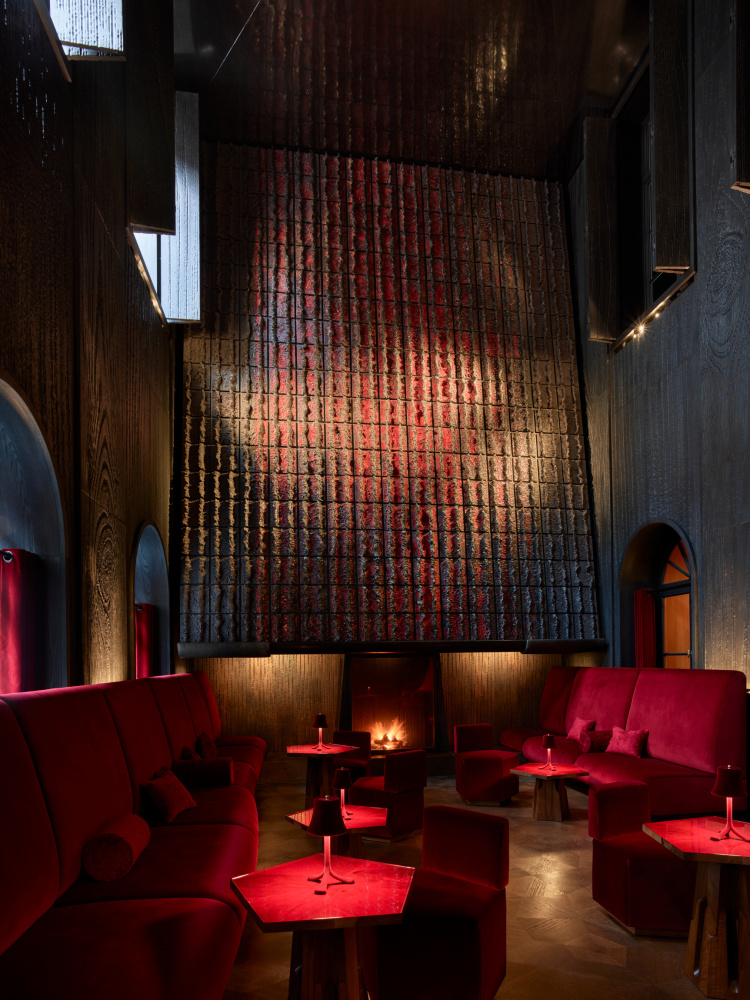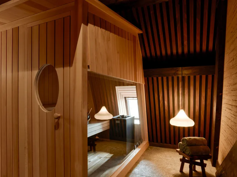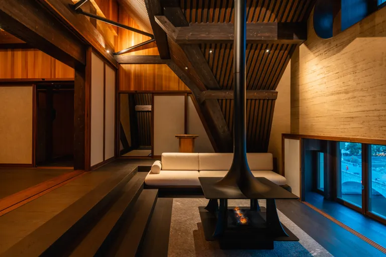 Tucked into the building’s original mansard roof, the spa channels the spirit of a Japanese onsen. Framed by cedarwood, adobe-inspired finishes, and shoji screens, the space unfolds across two levels with a steam room, sauna, plunge pool, and serene treatment rooms. Rustic beams become part of the décor, blurring architecture with atmosphere.