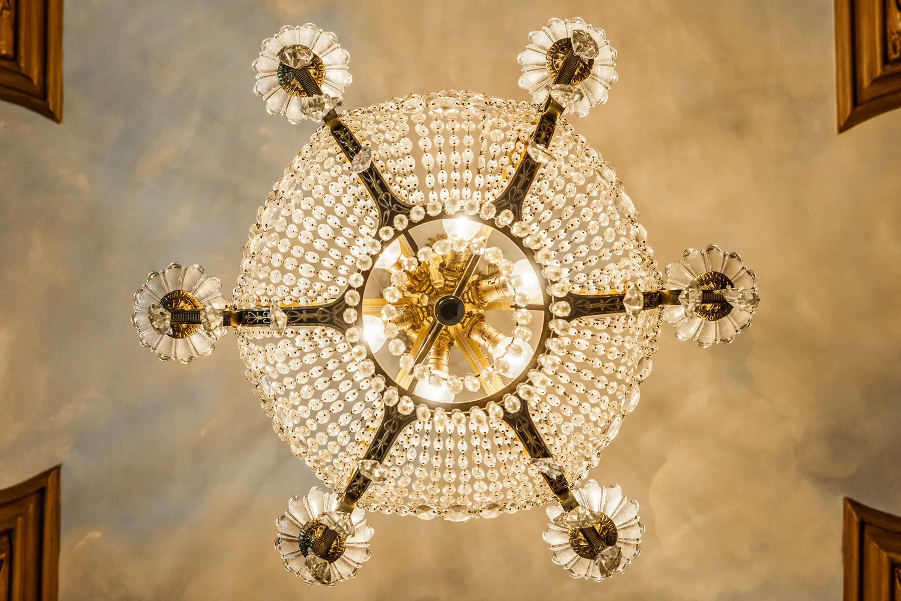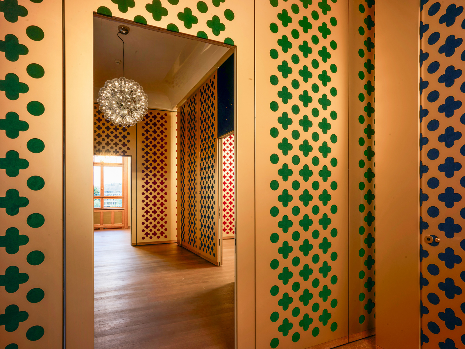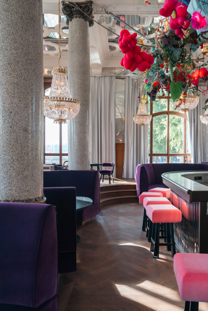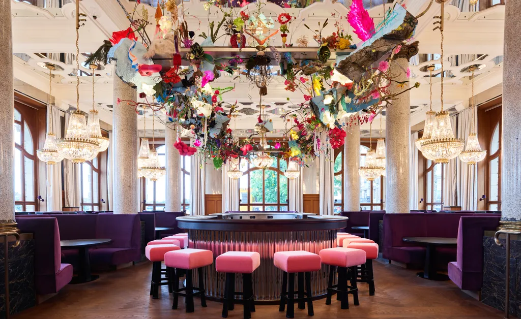 In the new ground-floor restaurant, views are everything. Tables are set on a U-shaped stage at window height, placing diners eye-to-eye with the river’s ever-moving current. A central chrome bar glimmers beneath a mirrored ceiling, which reflects the water below and an overhead installation by artists Gerda Steiner & Jörg Lenzlinger—a surreal cascade of crystals, fake flowers, and animal figurines that evokes a pop-art jungle.