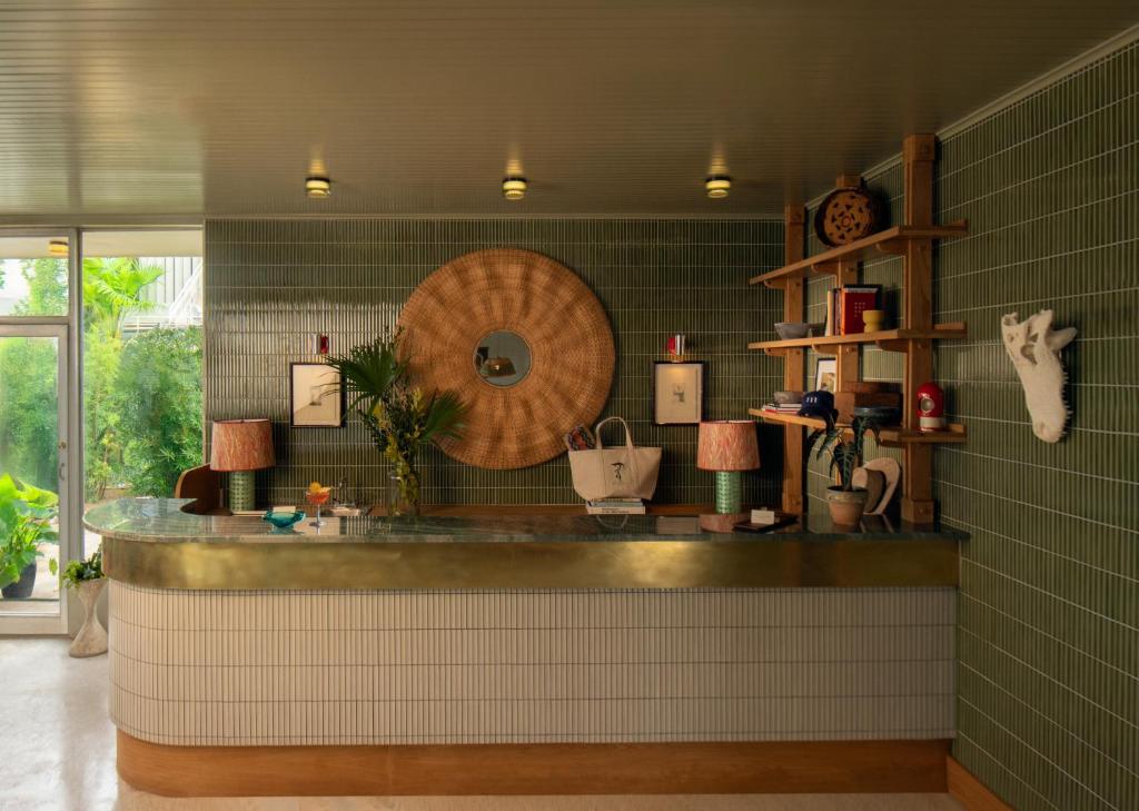 Once the Crescent Motel (and later The Drifter), this 1956 American motor lodge has been completely reborn as The Maidstone — an intimate, mid-century retreat in the Mid-City neighborhood, reimagined by Studio Tre with a designer’s eye and a sensual sense of place. Step into the lobby and the first thing you see is that green maestro quartzite check-in desk — bold, sculptural, practically cinematic — framed by floor-to-ceiling glazed porcelain walls. The color palette is pure Louisiana: Spanish moss sage, magnolia leaf olive, swamp grass green, bayou rust. It feels like the region itself got edited into a mid-century dream sequence.