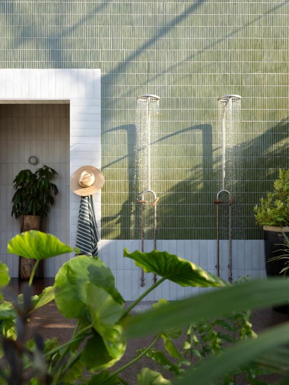 Outside, the Maidstone world expands. A saltwater pool. A bathing deck. A tiled wall fountain trickling over ceramic. Green-and-white striped solar shades sway like costuming. Textiles pop in indigo, chartreuse, olive, electric orange. This is tropical Americana — not borrowed from Miami or Palm Springs — born from the wetlands and the humid green of Louisiana.