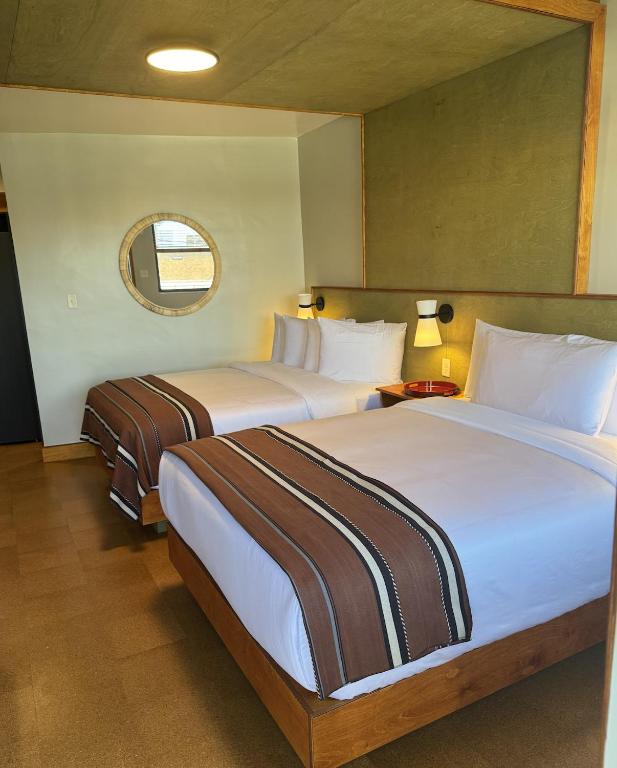 Guestrooms have been renovated with that same Studio Tre rigor: cork flooring, custom birch millwork, rattan mirrors, birch ply bed frames, furniture with rich natural textures. The beds are dressed with Frette linens. And above them — custom moon tapestries by Oaxacan textile artist Ismael Gutierrez Montano. The rooms feel minimal in form, maximal in soul. It’s modernism softened by nature, softened by New Orleans, softened by intimacy.