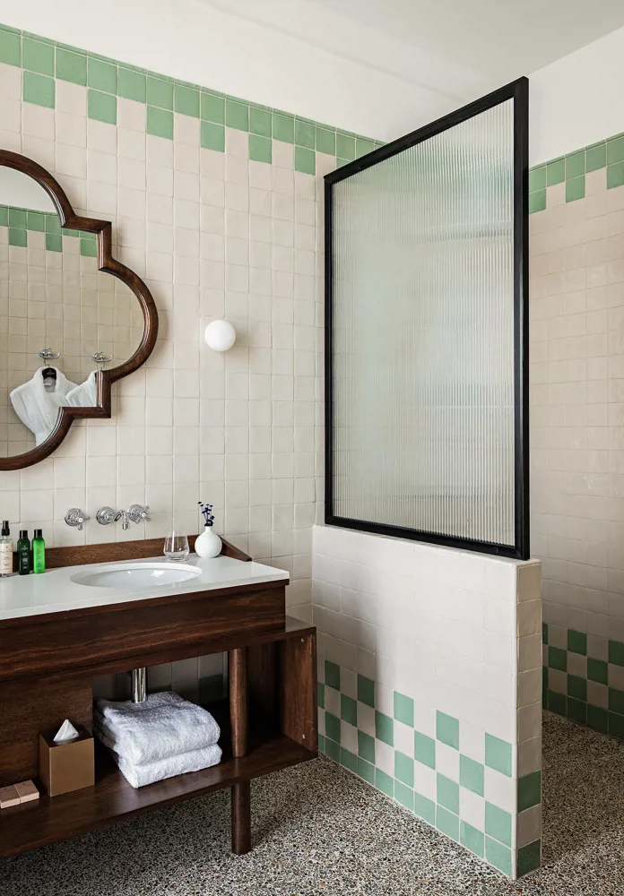 Inside, craftsmanship and intention guide every detail. Rich wood paneling, terrazzo flooring, and bespoke furnishings create a foundation of understated elegance. Layered in are curated textiles by Senegalese designer Maxime Liautard, bringing character and warmth. Guestrooms are equally expressive. Custom carpets in deep red or green set the tone, while expansive windows open onto lush gardens, erasing the divide between indoors and out. Bathrooms carry a spa-like serenity, with sage and cream tilework, Art Deco-inspired mirrors, and abundant natural light. It’s the kind of design that turns a simple stay into an experience worth repeating.