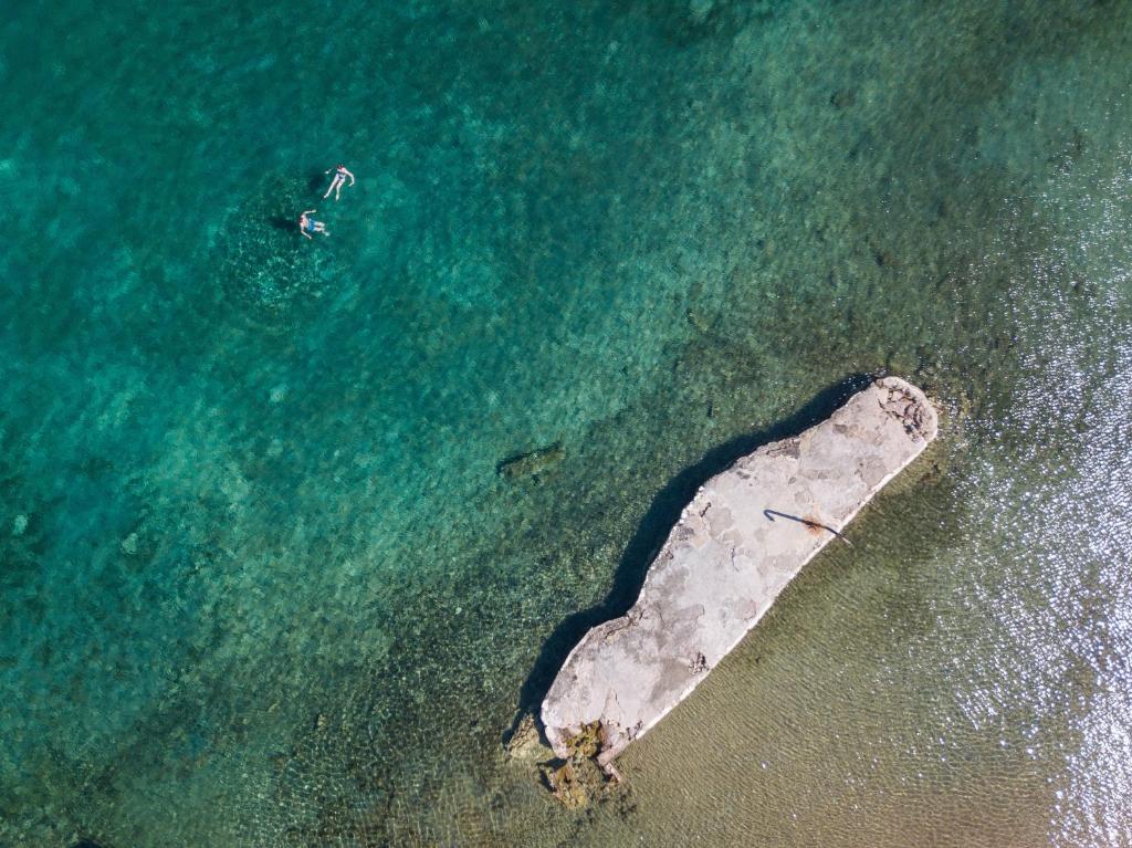 The resort’s aesthetic is a confident mix of Mediterranean restraint and naval relic revival. Raw stone walls, white-on-white interiors, and sleek teak furniture create a calm, tonal palette that lets the surrounding sea and light do the talking.