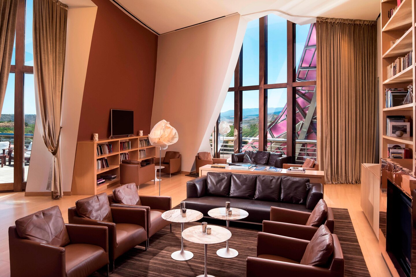 Inside, Gehry’s vision continues. Curved maple walls, bespoke leather furnishings, and unexpected lines create a dynamic interplay between comfort and curiosity. Every space—from the soaring lobby to the intimate guest rooms—invites you to explore. Light pours in through asymmetrical windows, casting ever-shifting shadows across interiors that blend innovation with indulgence. It’s a hotel where the architecture is as much a part of the experience as the view.