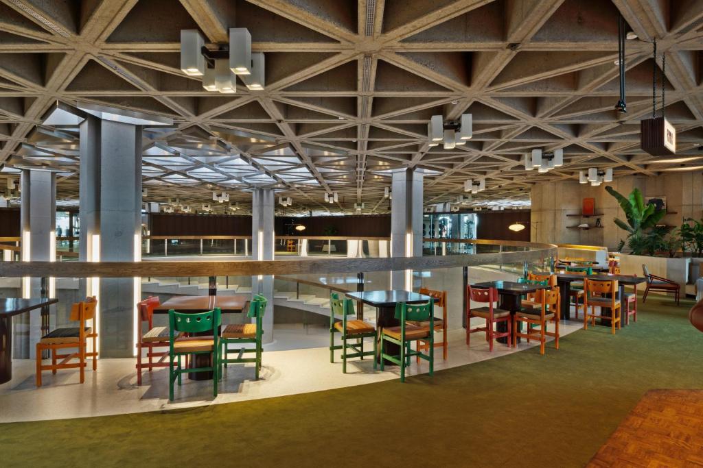 Inside, the vibe shifts from striking to soothing. Under the creative direction of Belgian designer Lionel Jadot, the interiors warm the building’s industrial bones with layers of texture and tone—wood, leather, stone, and lush greenery creating a dialogue between nature and structure. Every corner feels intentional, every material tactile. The design flows effortlessly from lobby to bar to guestroom, grounding the grandeur of Brutalism in something human, soulful, and surprisingly cozy. Guestrooms carry this philosophy through: sleek, minimalist spaces with generous light, warm woods, and muted tones that let the building’s sculptural lines shine. It’s Brutalism softened, reimagined for rest and reconnection.