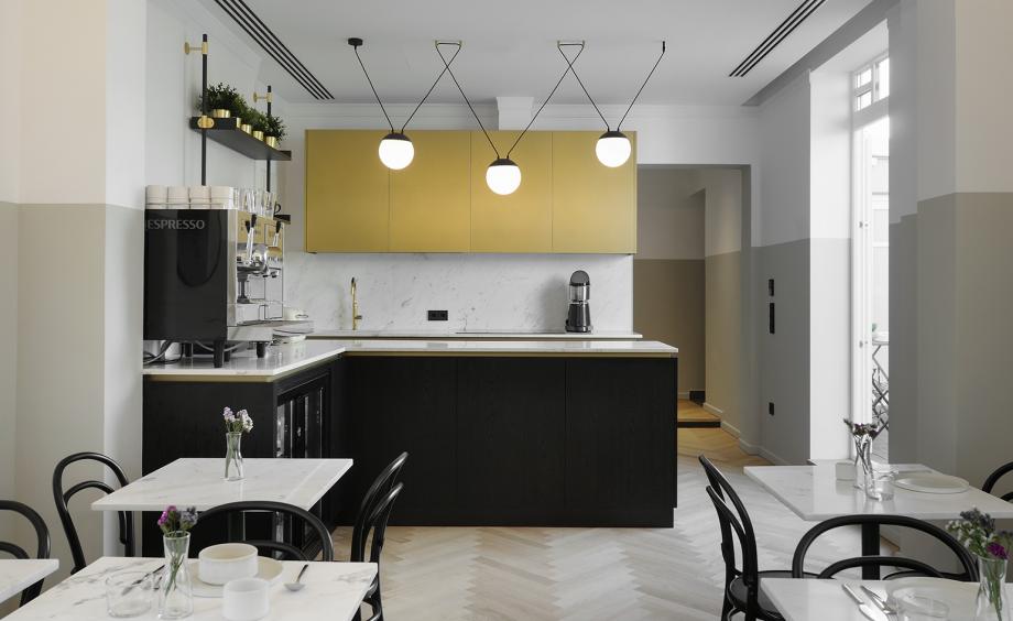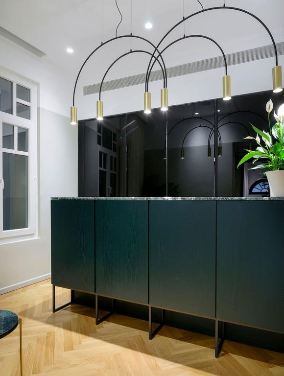 The Modernist doesn’t demand your attention—it earns it. Every square meter has been thoughtfully shaped, with a designer’s eye and an architect’s precision. High windows, pale drapes, and clever mirrors open up the space, while custom wall-mounted furniture, brass lighting, and under-bed storage make even tight rooms feel expansive and comfortable. The design draws attention to what remains: the original parquet floors, the ornate cornices, the building’s quiet grandeur. Modernity here isn’t a look—it’s an attitude.