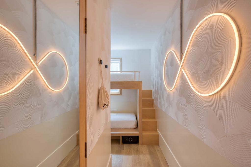 MoMo’s rooms are unapologetically compact—base camps built for sleep, showers, and fast outfit changes. Yet Akin Atelier’s clever design gives these micro spaces surprising warmth. Blond wood accent panels, recessed lighting, light pink palettes, and slide-away storage nooks create depth and calm. Raised platforms hide shoes, smart TVs fill downtime, and mood lighting softens the raw finishes. The smallest rooms, featuring bunk beds in just 11-12m2 (120–130 sq ft), are unexpectedly fun; Crashpad rooms offer queen beds on tatami-style platforms, while Crashpad Twins cater to friends splitting the space. Even inward-facing rooms feel airy thanks to a capacious lightwell carved through the building’s core.