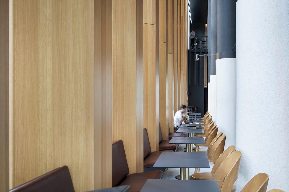 Monville’s look is just as forward-thinking as its tech. The airy lobby features oversized photography by local artist Valérie Jodoin Keaton, setting a tone that’s more gallery than lobby. Sustainable uniforms by Frank and Oak underscore the hotel’s commitment to local design. In the rooms, industrial elements like exposed concrete and steel meet warm wood and soft lighting, creating a modern aesthetic that feels cool, not cold. Floor-to-ceiling windows flood the spaces with light and open the city skyline to view.