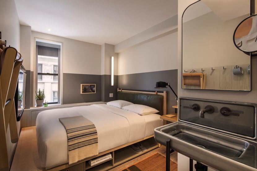 Stonehill Taylor’s architectural reimagining respects the building’s Beaux-Arts façade while infusing the interiors with a youthful, urban verve. Inside, Yabu Pushelberg’s signature aesthetic takes over: compact yet clever rooms that make every square inch count. Expect foldaway furniture, glass walk-in showers, cheeky wall art, and industrial details that balance warmth and edge. It’s a space designed for rest and recharge, but it never forgets the fun.