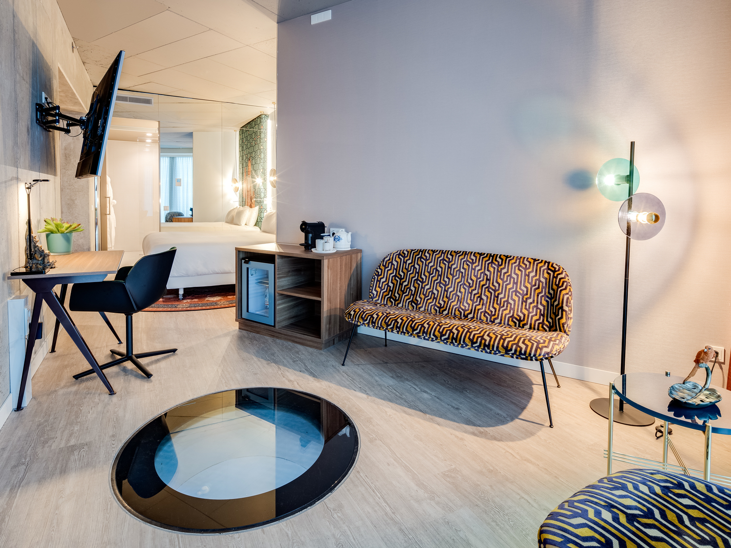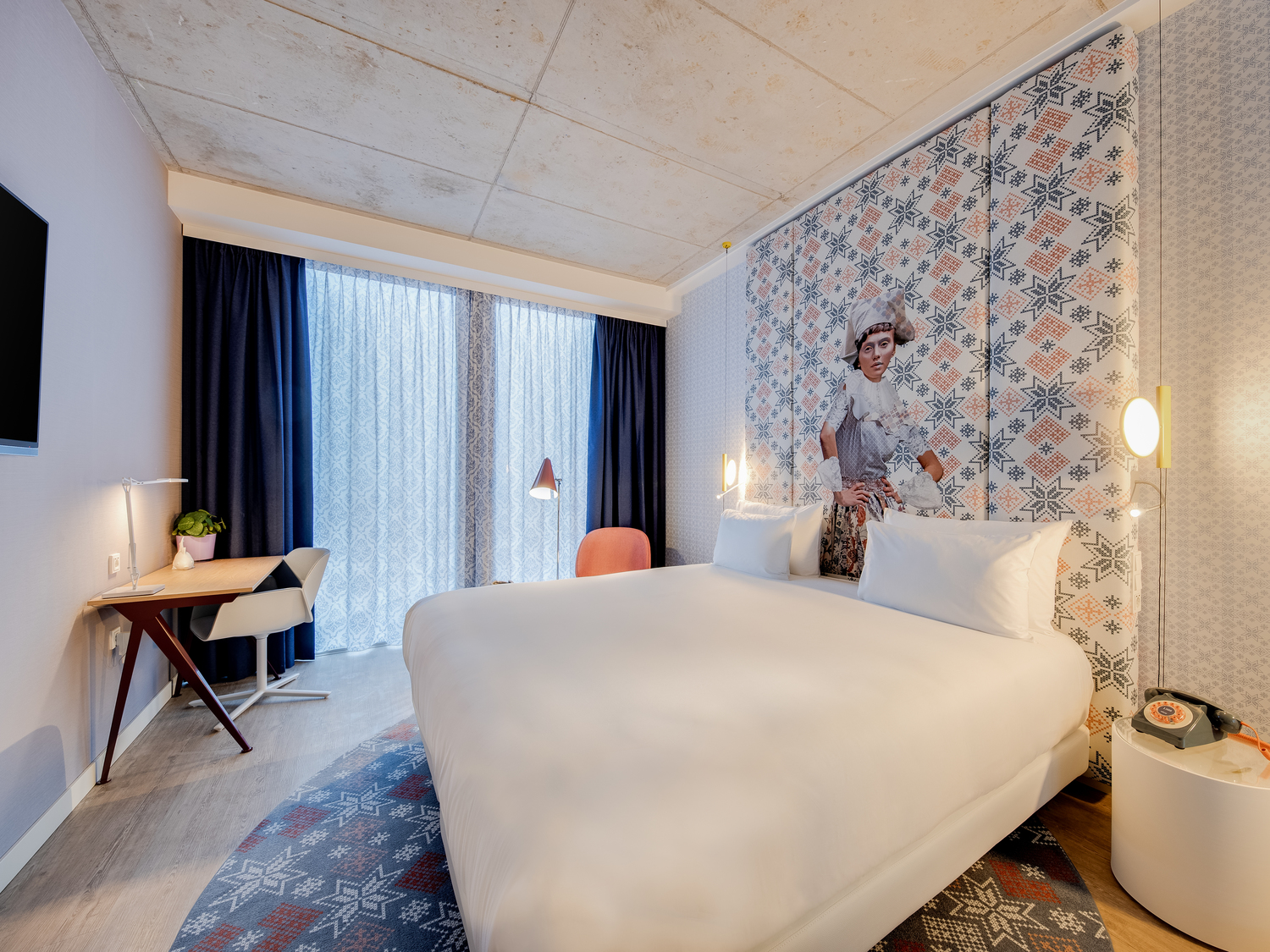 Step inside and the pace doesn’t slow. Color, culture, and contrast collide in a whirlwind of pattern and personality. The interiors — conceived by NEXT Architects in collaboration with GLG/MVSA — are a playful, globe-trotting journey through the world’s visual languages. Think Japanese cherry blossoms beside Mexican Día de Muertos skulls, Indian mandalas meeting Dutch Delft-blue patterns, and African geometrics blending with European minimalism. It’s a celebration of exchange — the kind that built Amsterdam’s identity — reinterpreted through a contemporary, design-forward lens. The lobby sets the tone with monumental murals, sculptural lighting, and an explosion of texture, while tucked-away lounges offer quieter pockets for conversation, work, or creative pause. The mood is exuberant but never chaotic — curated chaos, perhaps — mirroring the spirit of a city that thrives on openness and reinvention.