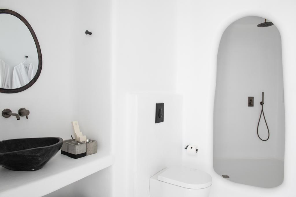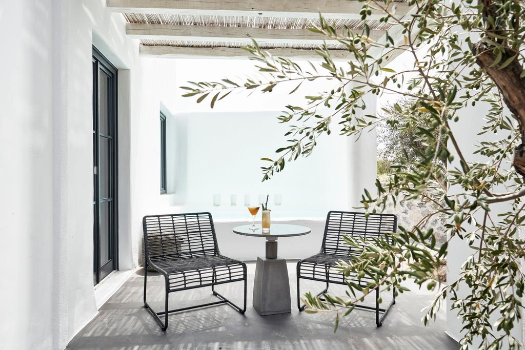 Two infinity pools stretch like liquid glass toward the Aegean. Interiors lean elemental: bleached wood, smooth stone, dark metal. Low olive trees and the scent of wild rosemary root the place in the landscape, while massive boulders of black volcanic rock are positioned like abstract sculptures in the courtyards.