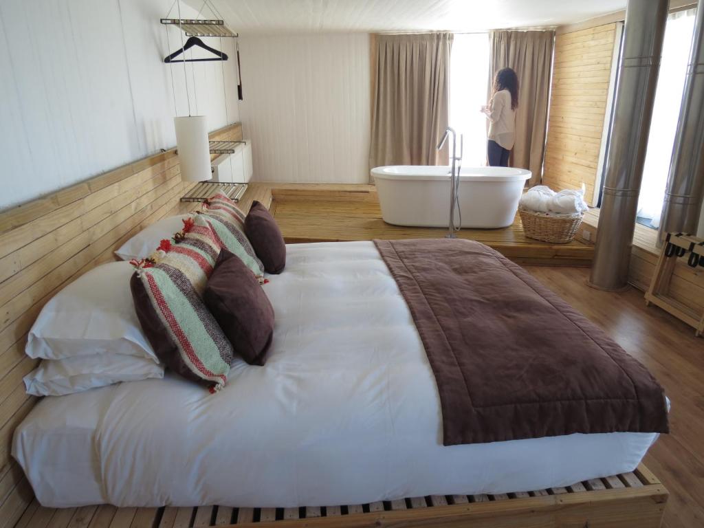 Guestrooms continue the minimalist aesthetic with a crisp palette of black, white, and natural wood, accented by bursts of deep red—a nod to Patagonia’s fiery sunsets. The design is sleek but tactile, blending Scandinavian restraint with Chilean soul. Large windows blur the line between indoors and out, showcasing views that stretch from glacial peaks to the mirror-still fjord. Upgrade to a suite, and you’ll find indulgent touches like a private jacuzzi, a wood-burning stove, or even panoramic soaking tubs designed for post-trek bliss. It’s understated luxury at the edge of the world—unfussy, functional, and quietly stunning.