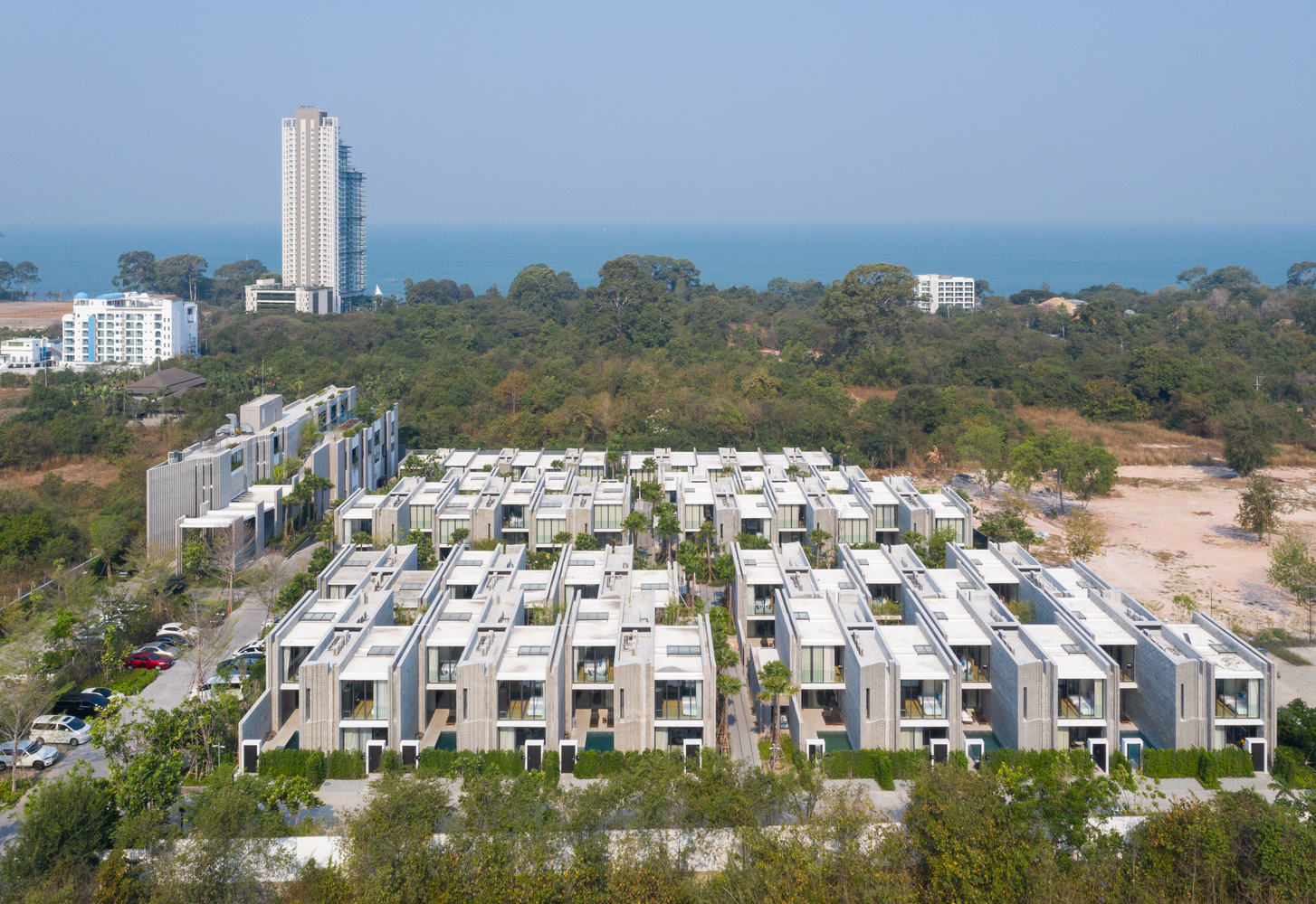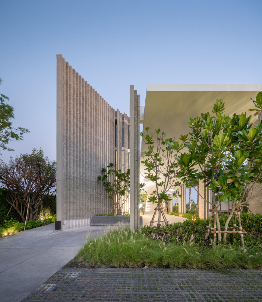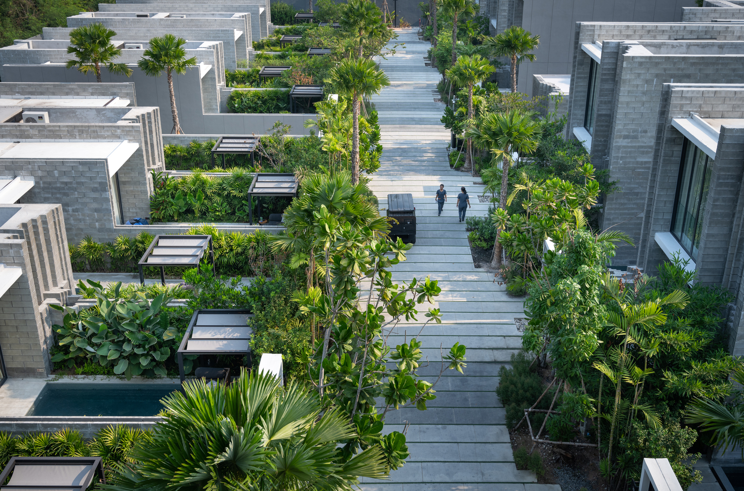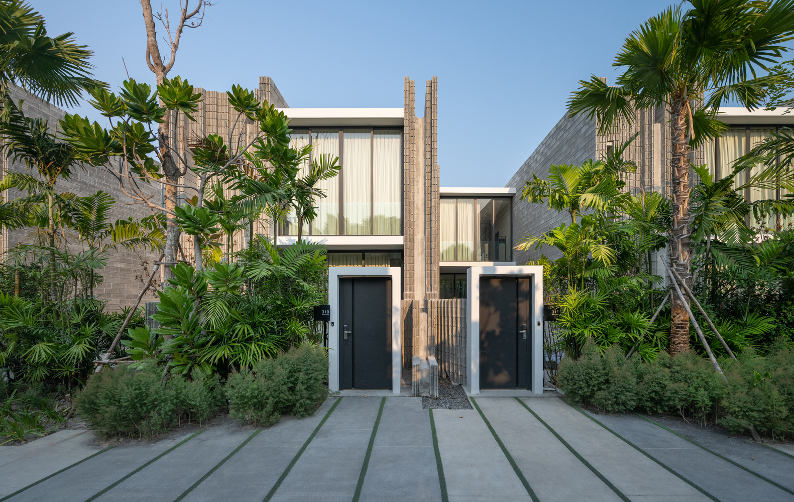 The design is rooted in the concept of modular living, with each villa forming part of a seamless architectural rhythm: cubist volumes arranged around private plunge pools, creating intimate pockets of privacy and calm. Vertical fins, timber screens, and concrete planes give the exterior a modern edge while also responding to Thailand’s climate with shaded outdoor spaces and passive cooling.