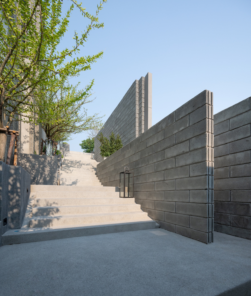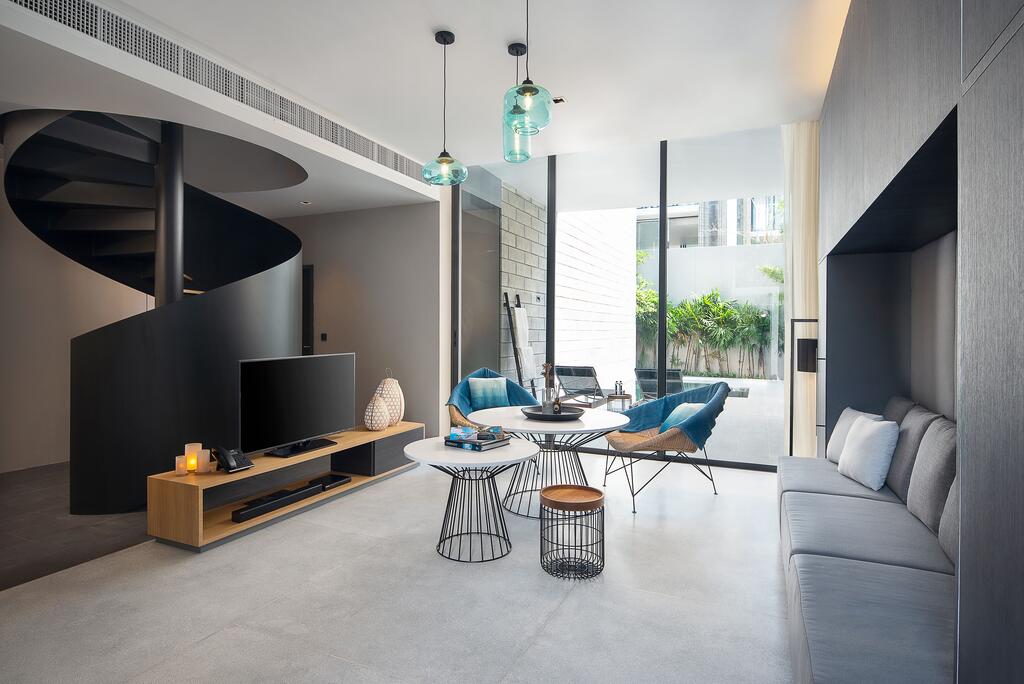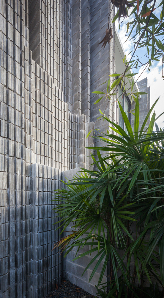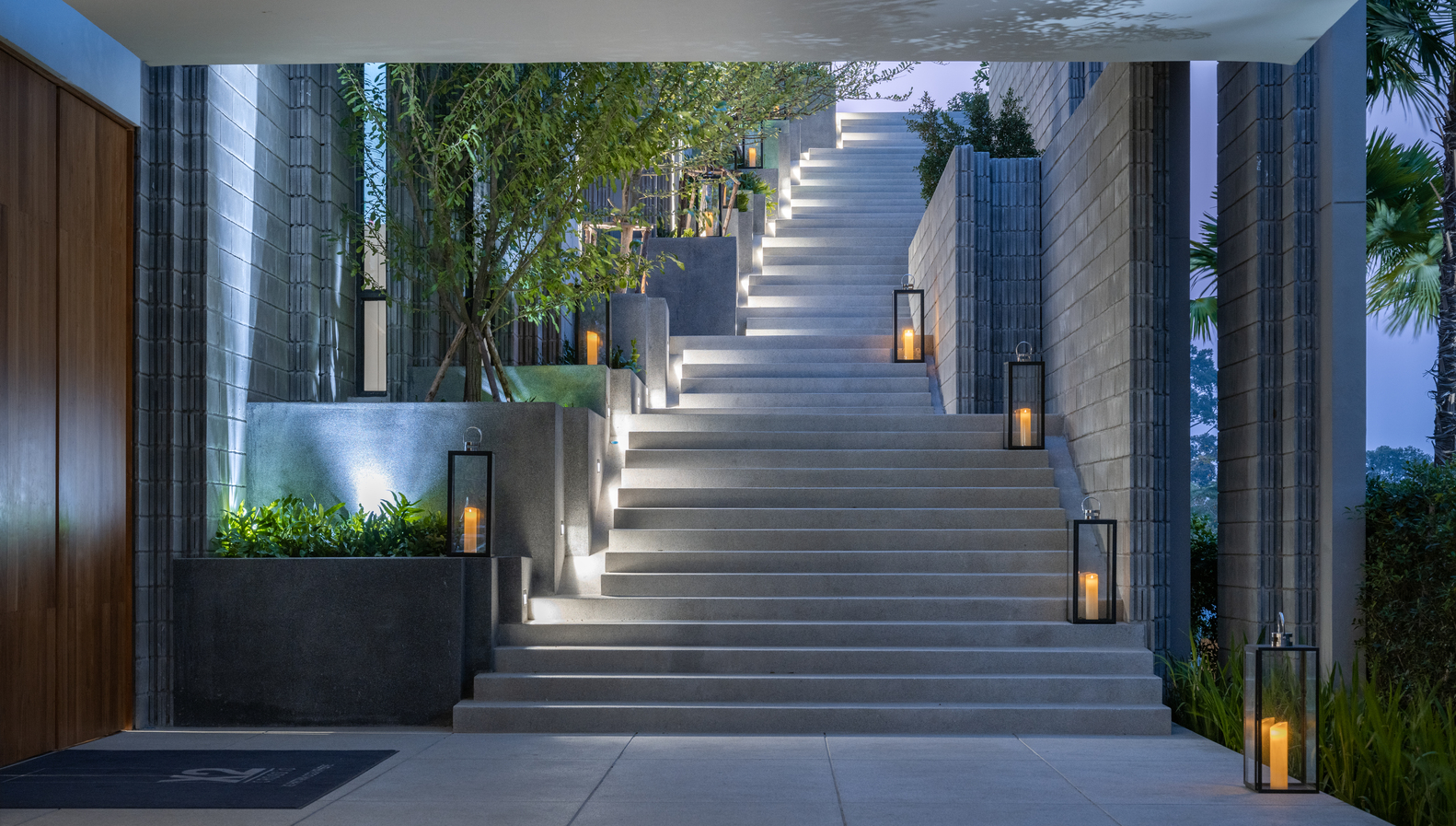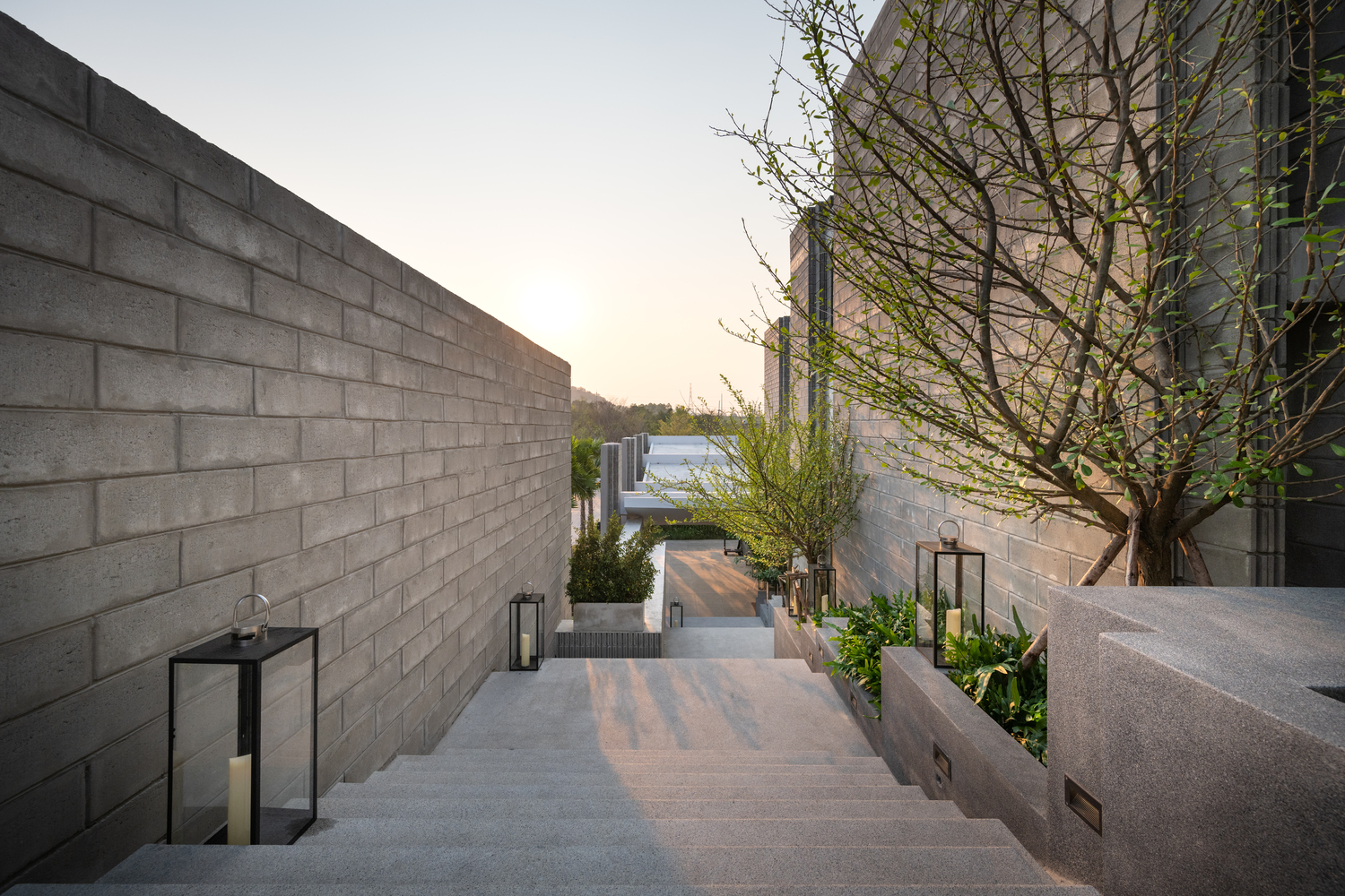 The design is rooted in the concept of modular living, with each villa forming part of a seamless architectural rhythm: cubist volumes arranged around private plunge pools, creating intimate pockets of privacy and calm. Vertical fins, timber screens, and concrete planes give the exterior a modern edge while also responding to Thailand’s climate with shaded outdoor spaces and passive cooling.