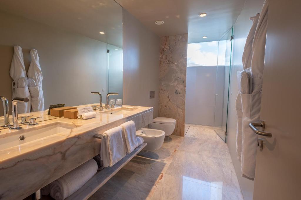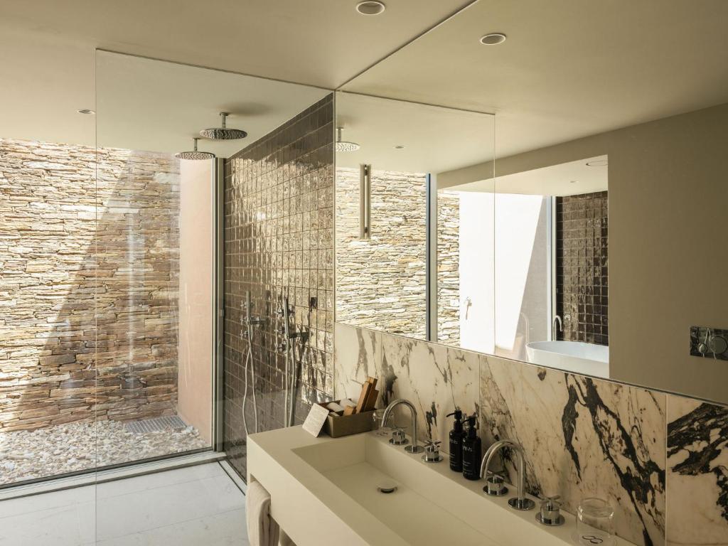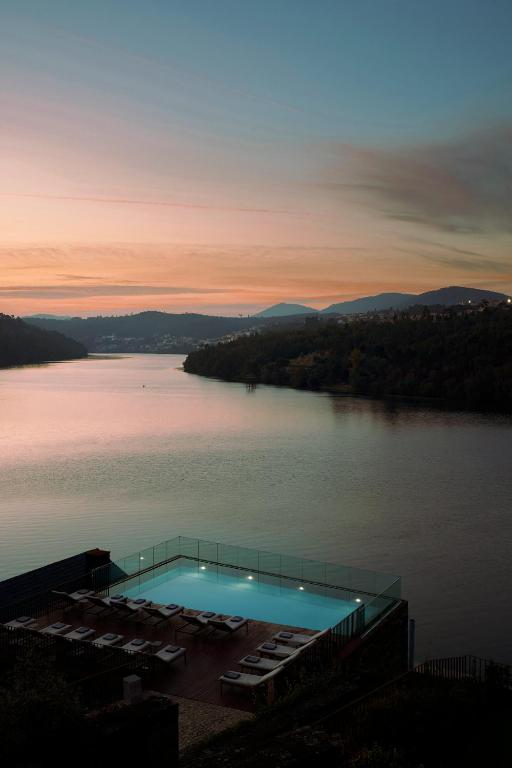The hotel’s restaurant and bar continue the architectural journey, framed by vast windows that make dining feel like floating above the river. The culinary philosophy follows the same principle as the building itself: contemporary, grounded, and shaped by the land. Local produce and regional wines take center stage, reinterpreted through refined simplicity. And then there’s the spa—half glass, half granite—a space of elemental contrasts that offers one of the most spectacular indoor pools in Portugal. The water seems to spill directly into the Douro itself, creating an illusion of infinite continuity between nature and design.