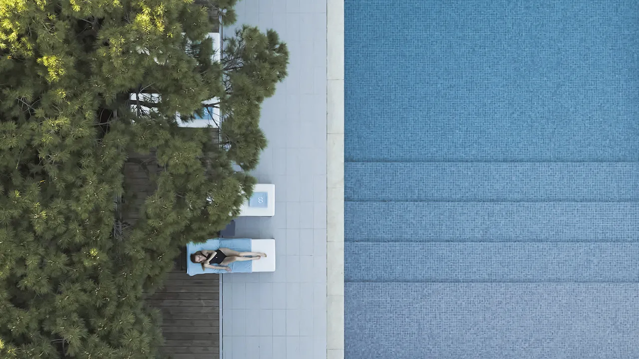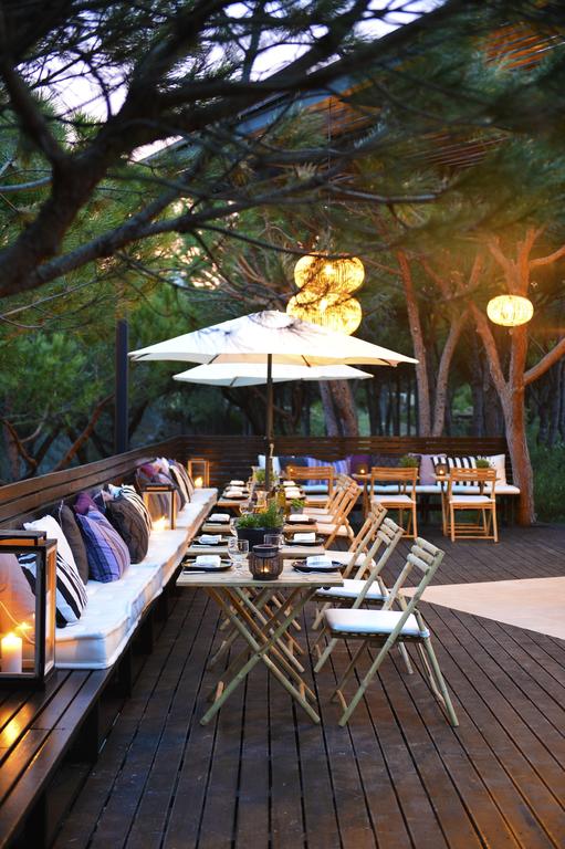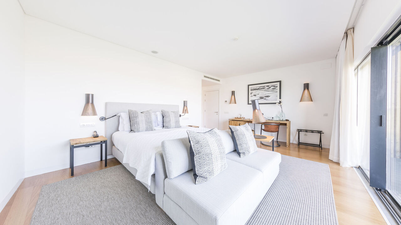 Outside, the pool unfolds beneath fragrant maritime pines, an elevated deck dotted with loungers and a bar ready with cocktails and coastal bites. The ambiance feels both beachy and refined—sun-drenched yet shaded by nature. And when the mood shifts to saltwater, Praia Verde’s pale sand lies just a short stroll away, with straw parasols and beds awaiting (available at a small fee), the Atlantic stretching wide and wild before you.