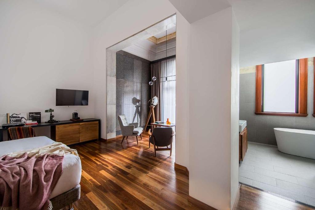 There’s no cookie-cutter design here. Each of the 62 rooms has its own look and feel, blending warm materials with modern touches. You’ll find custom lighting, designer furniture, and freestanding bathtubs perched under warehouse windows. Some rooms still carry scars from the past — like mismatched floor tiles or oddly placed beams — but that’s what gives them personality. It’s like staying in a design magazine that remembers it used to be a factory.