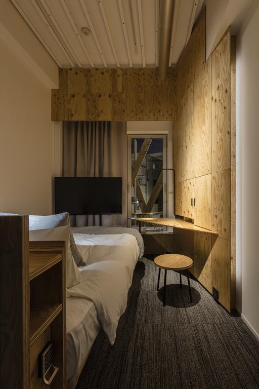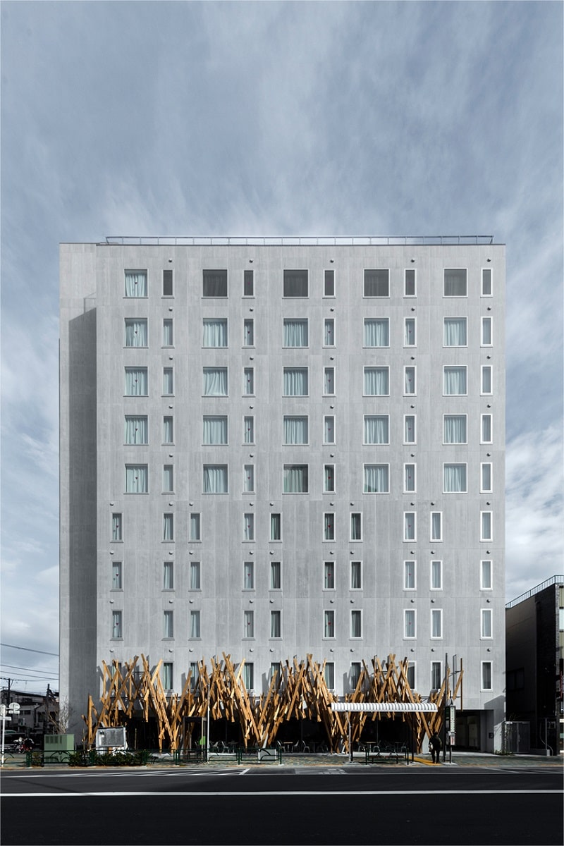 ONE@TOKYO is a stylish design hotel in the eastern Oshiage district, welcoming guests with a dramatic architectural gesture: a lattice of raw timber planks wrapped around the base of a ten-story concrete tower. This striking contrast—organic warmth meeting urban strength—sets the tone for the hotel’s design narrative. Inside, a 15-meter-long counter stretches from reception into the restaurant and bar, blurring boundaries between check-in, dining, and social space. An outdoor terrace connects the building back to the neighborhood, embedding the hotel into the pulse of Oshiage.