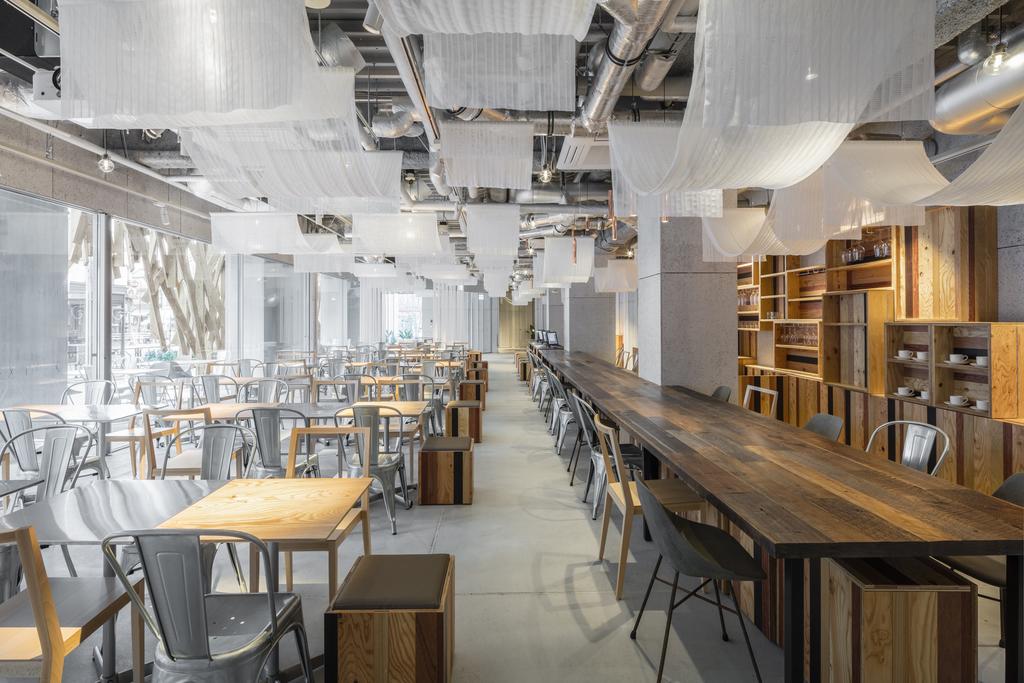 Rooms range from compact studios to loft-style suites, each carrying an industrial-inspired aesthetic. Exposed ceilings, plywood panels, and clean-lined furnishings embrace raw honesty while keeping the mood serene and livable. Minimalist but not sterile, the interiors prioritize clarity and comfort. For something more unique, the upper floors house the Atelier suite—designed like an artist’s studio—and the Library suite, a retreat for book lovers with walls lined in curated titles. Both capture the hotel’s mission: to make each stay a creative experience.