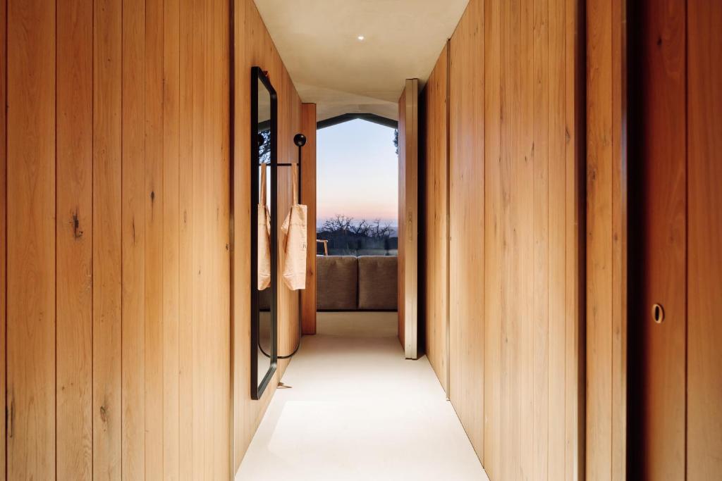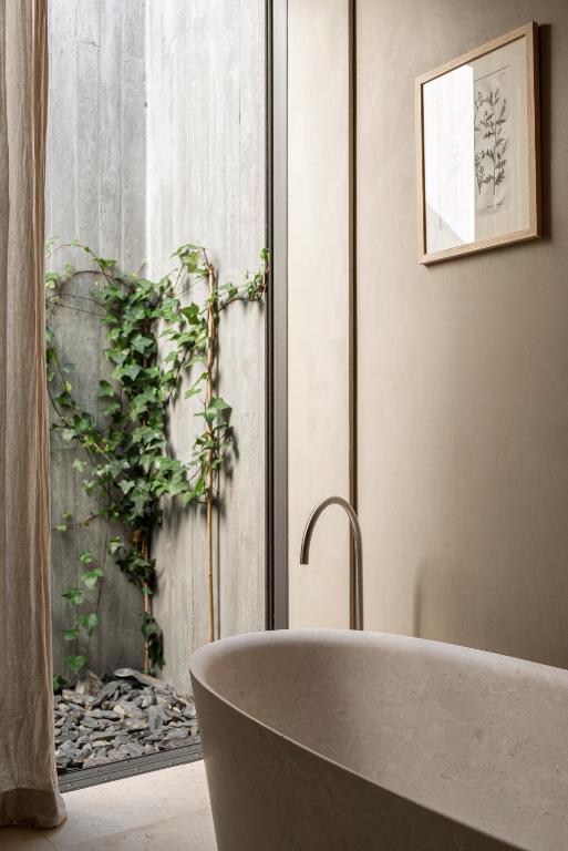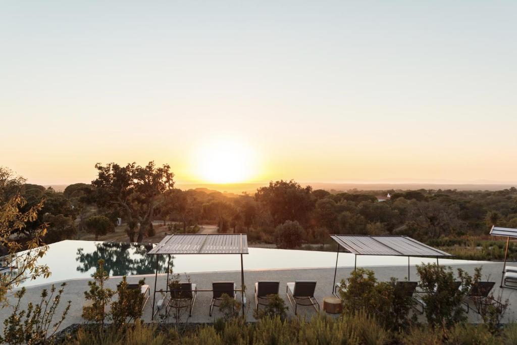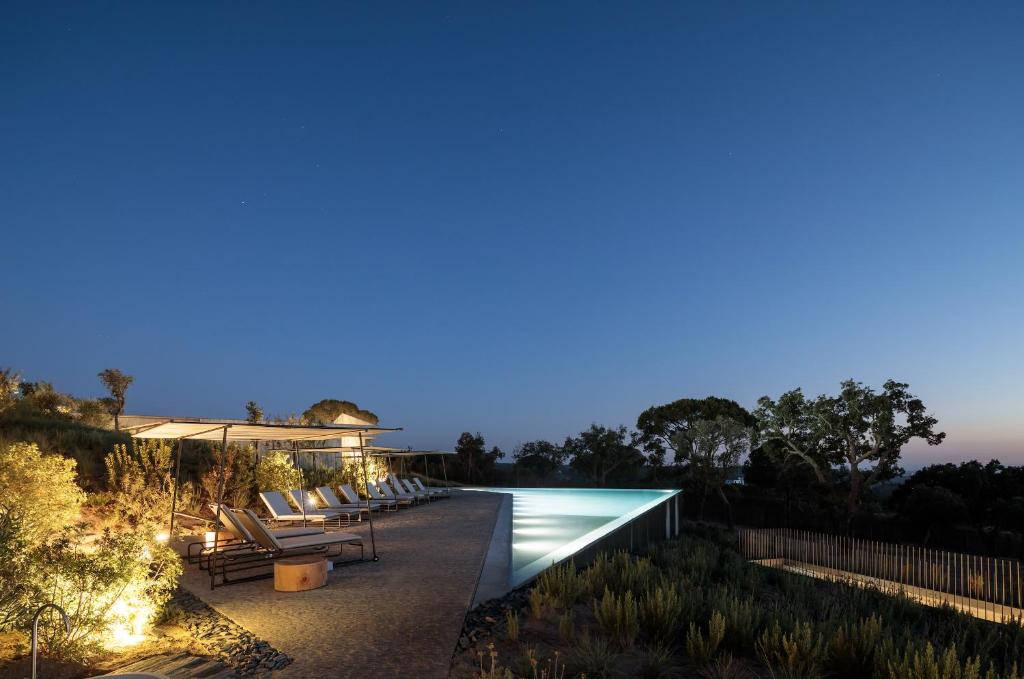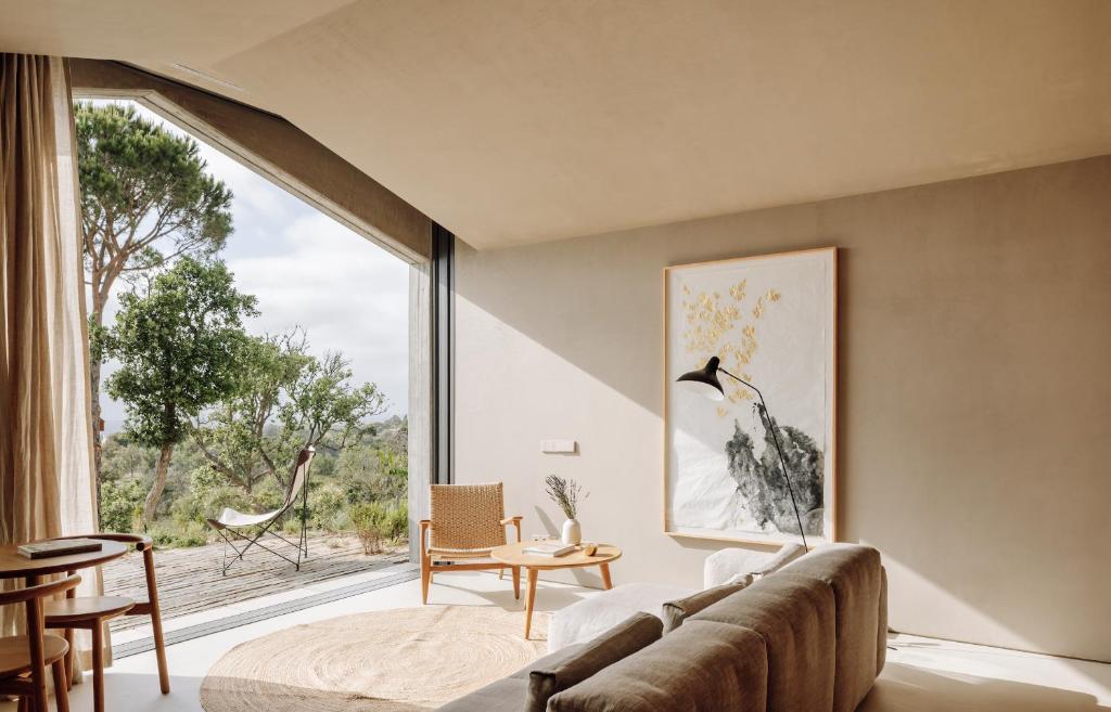 Each house—ranging from intimate one-bedroom suites to expansive three-bedroom dwellings—offers a unique perspective on the Alentejo’s untamed beauty. Whether it’s a framed view of the Atlantic glimmering in the distance or the silhouette of cork oaks against a rose-tinted sky, every angle feels intentional, almost cinematic. Outdoor showers are sheltered by curving walls, offering both privacy and connection to the breeze. Dining spaces spill into the open air, and terraces invite long afternoons of reading, resting, and simply watching the landscape shift with the light.