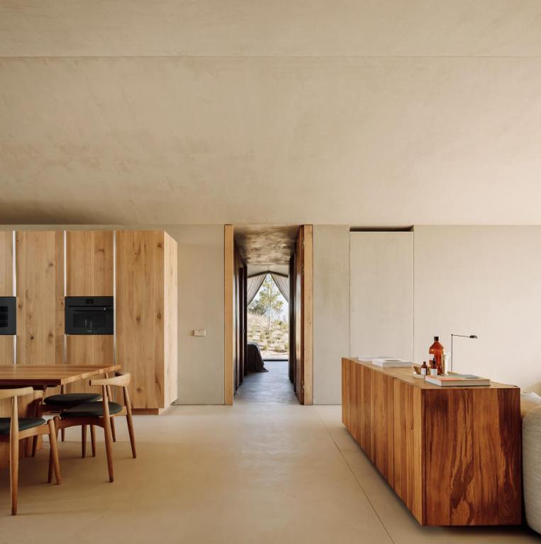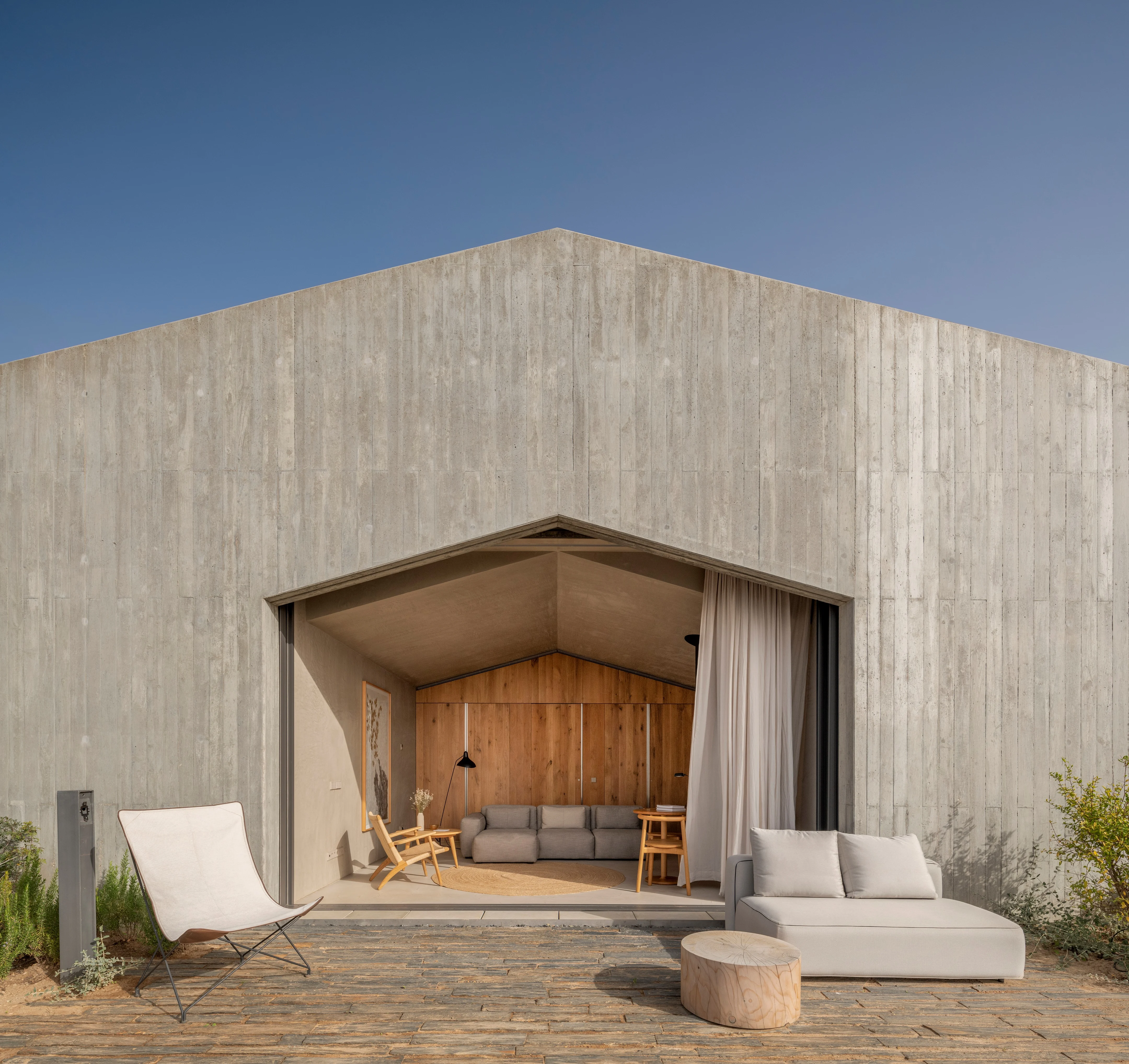 From afar, the four monolithic courtyard houses of Pa.te.os emerge as extensions of the terrain—bold yet subtle, massive yet weightless. Their raw concrete façades mirror the muted tones of the surrounding hills, while openings are precisely cut to capture slivers of horizon, ocean, and sky. Inside, the architecture is pure emotion. Glass walls dissolve into the landscape, turning living rooms into outdoor galleries of light and shadow. Inner patios—open to the sky—serve as contemplative sanctuaries, drawing the gaze upward in quiet wonder, evoking the spiritual geometry of James Turrell’s skyspaces. Every space is designed with restraint and reverence: smooth concrete floors, soft natural linens, and sculptural minimalism that lets the landscape speak louder than the architecture itself.