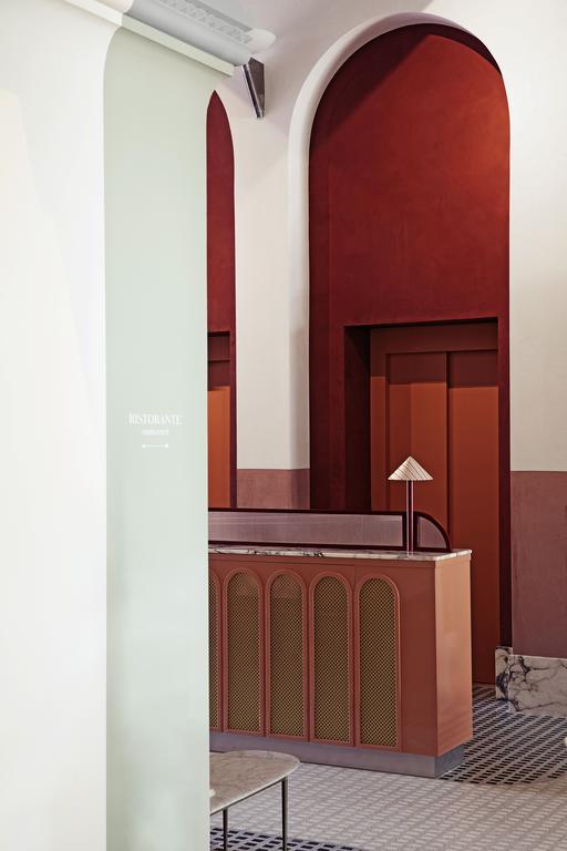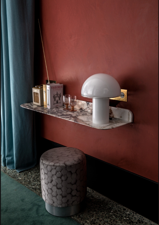 Step inside, and the contrast is instant yet harmonious. Meilichzon’s signature language—curves, color, craftsmanship—animates the palazzo’s solemn bones. Hand-glazed tiles, velvet banquettes, and polished Breccia Capraia marble catch the morning light, while terrazzo floors and dark carved woods whisper back to Venice’s gilded past. Walls of Marmorino plaster, the same material favored by Doge’s palaces, ground the interiors in history, but the palette—dusty terracotta, lagoon blue, soft saffron, and oyster white—feels distinctly Mediterranean, airy, and alive. The result is cinematic: a cross between a Wes Anderson reverie and an Italian daydream. The rooms balance glamour with intimacy. Each is a study in soft geometry and subtle luxury—arched headboards, rattan chairs, vintage mirrors, and brass lamps combine with playful patterns and contemporary restraint. Large windows flood the space with Venetian light, framing canal views that seem painted for contemplation.