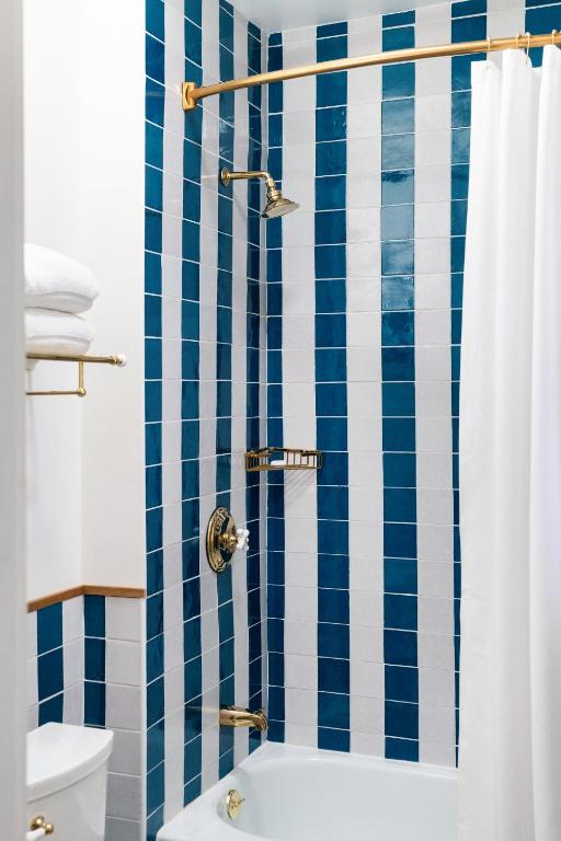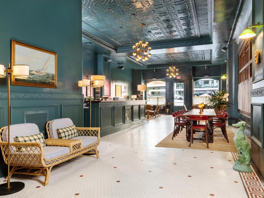 Interiors channel retro-nautical vibes with brass fixtures, deep navy and forest-green tones, leather banquettes, and vintage-inspired furnishings. Playful details—like maritime artwork, patterned carpets, and tongue-in-cheek nods to seafarers—give the hotel a personality that’s equal parts nostalgic and contemporary. It feels curated yet approachable, in true Palihotel fashion.