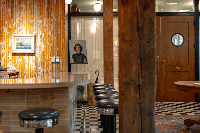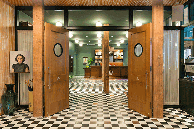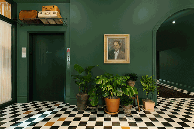 Green is more than a color here—it’s a mood. In the reception and lounge, deep emerald walls wrap the space in warmth, while honey-tan leather sofas gather around sculptural driftwood coffee tables. The black-and-white checkerboard floor adds a dash of vintage drama, leading guests toward the hotel’s restaurant and coffee bar. There, the palette lightens: whitewashed exposed brick and airy finishes create a sunlit counterpoint to the moody entrance.