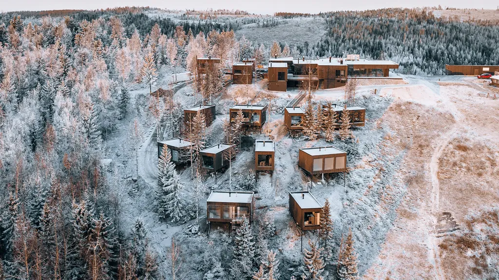 Tucked deep within the pristine forests of Eastern Finland, Panorama Landscape Hotel offers a retreat that’s equal parts luxury hideaway and nature sanctuary. With just ten intimate cabins, a world-class restaurant, and a spa inspired by ancient bathing rituals, it’s a place where stillness reigns and every detail feels deeply considered. The hotel’s philosophy is simple yet profound: design should blend with nature, not compete with it. And here, that idea comes vividly to life. Each cabin sits quietly among pine and birch, their shingled walls and green roofs disappearing into the forest canopy. From the inside, floor-to-ceiling panoramic windows frame endless views over Lake Syväri, turning every sunrise into an event and every snowfall into theater.
